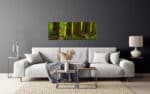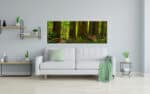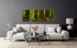 A vertical panoramic photograph of a beautiful cascading waterfall surrounded by forest and rocks, ideal for wall decor.