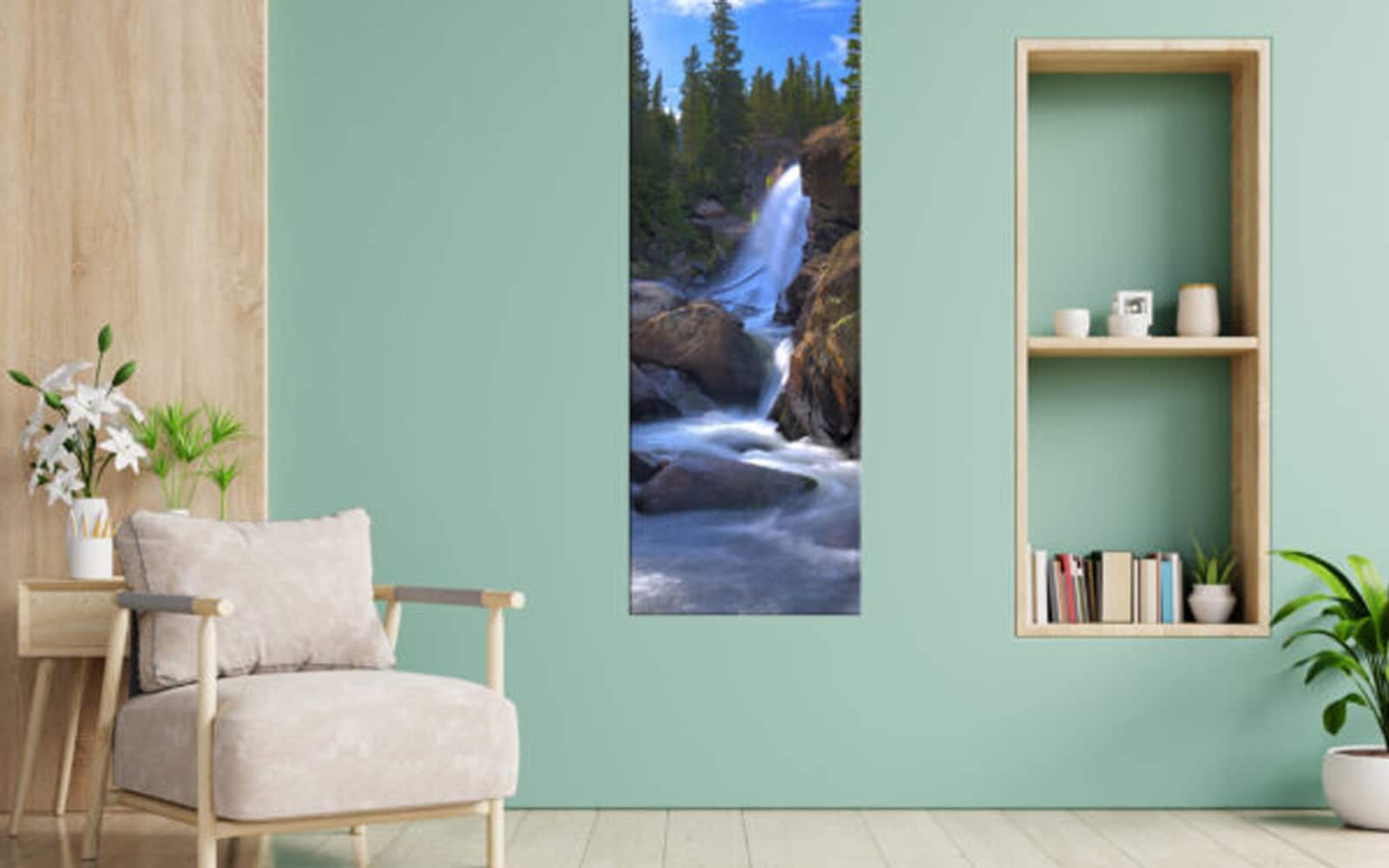 A vertical panoramic photograph of a beautiful cascading waterfall surrounded by forest and rocks, ideal for wall decor.