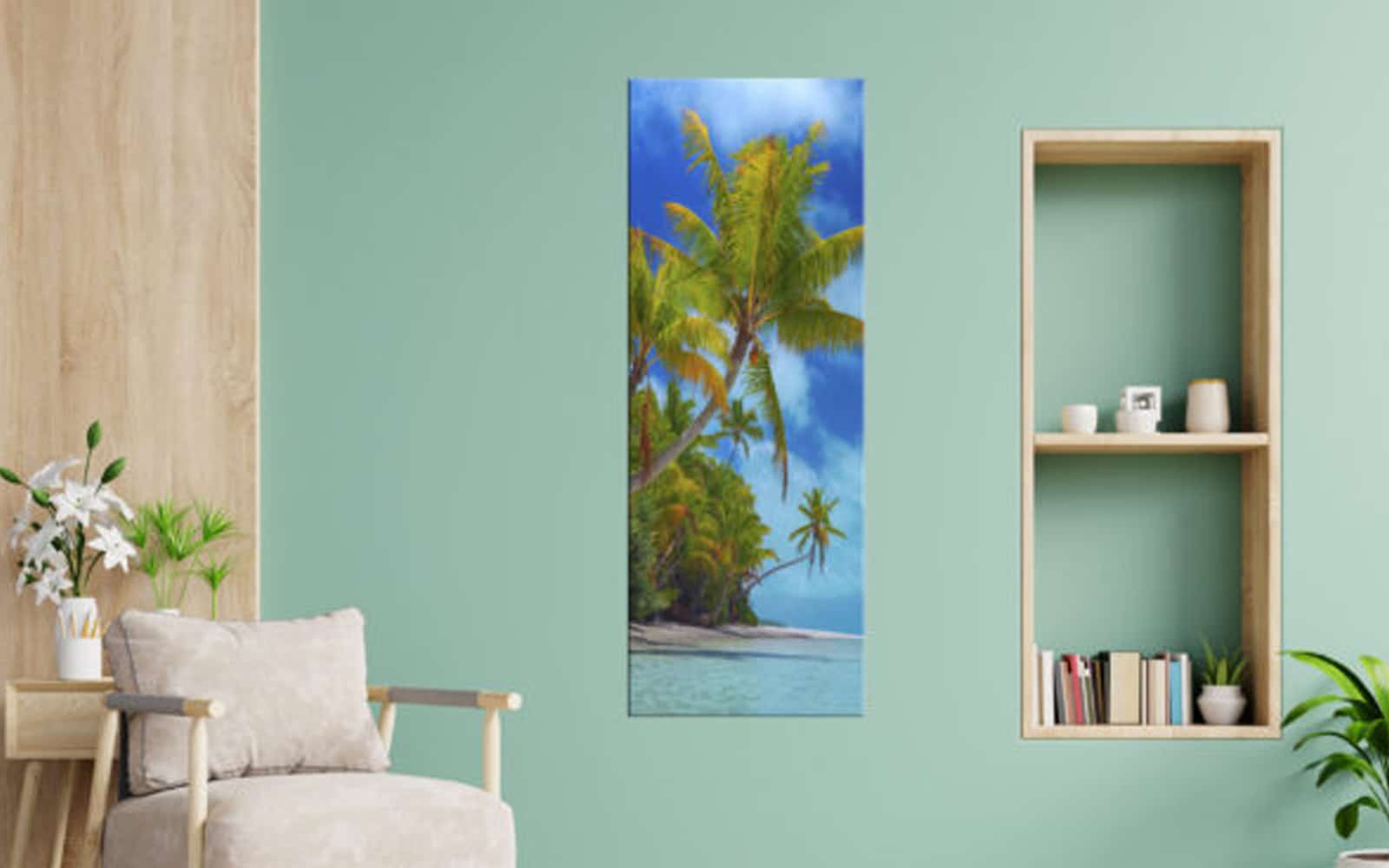 A panoramic art print featuring a pristine tropical beach with clear turquoise waters, lush palm trees, and a sunny blue sky.