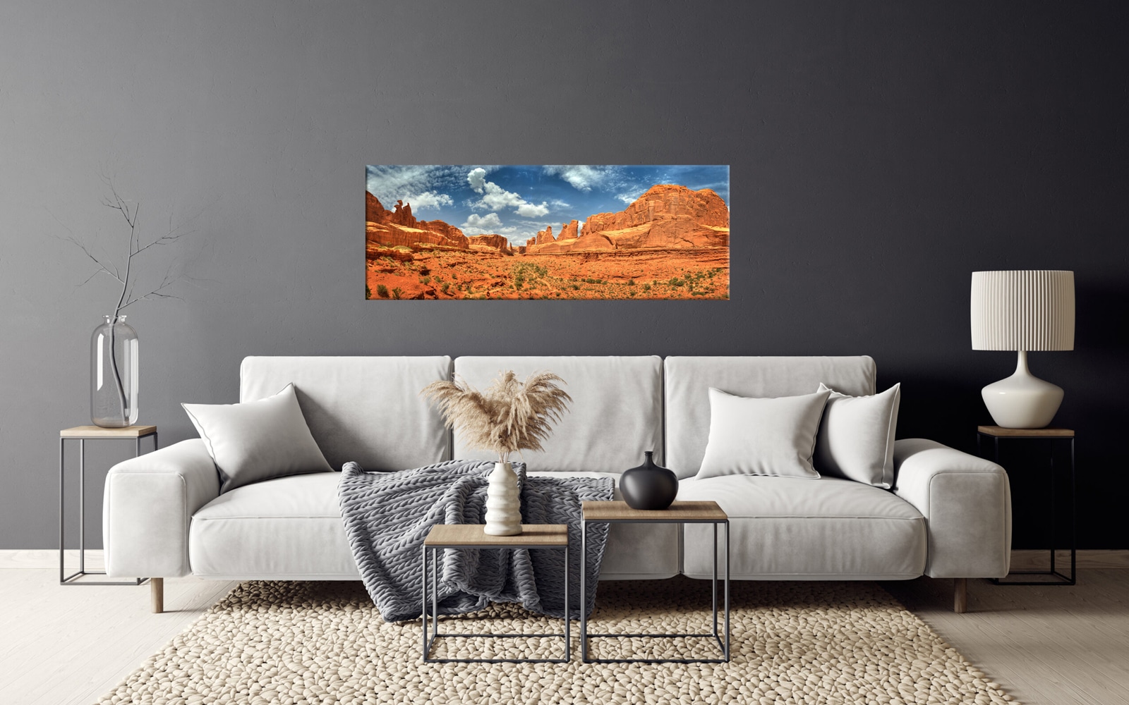 A panoramic image of a desert landscape featuring red rock formations under a blue sky with clouds at Arches National Park.