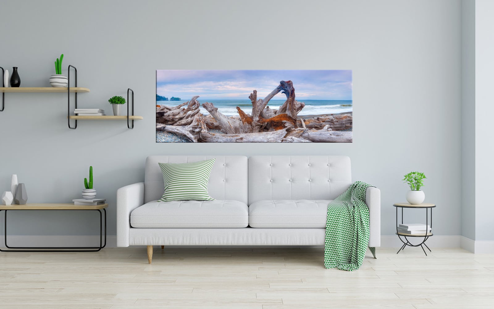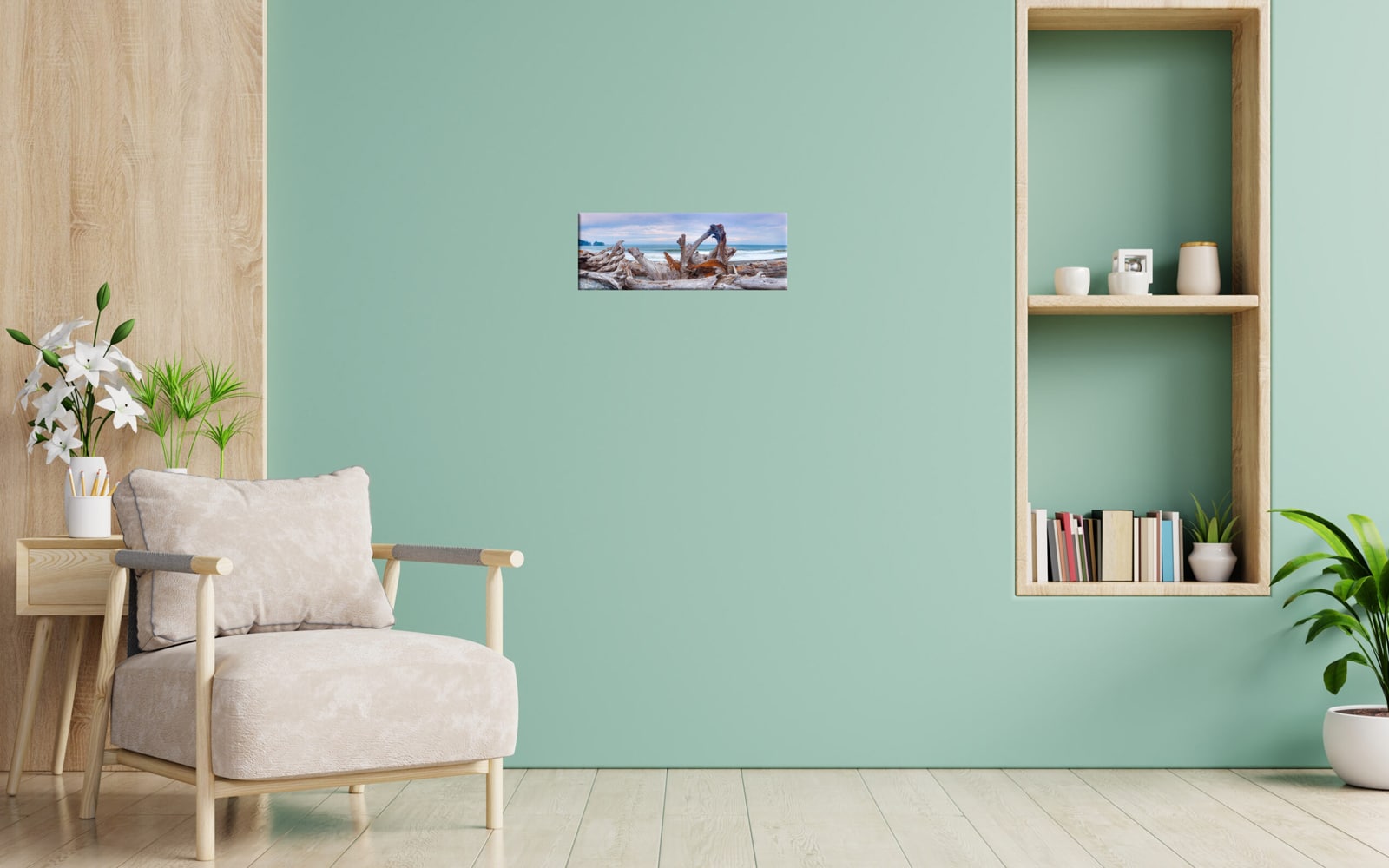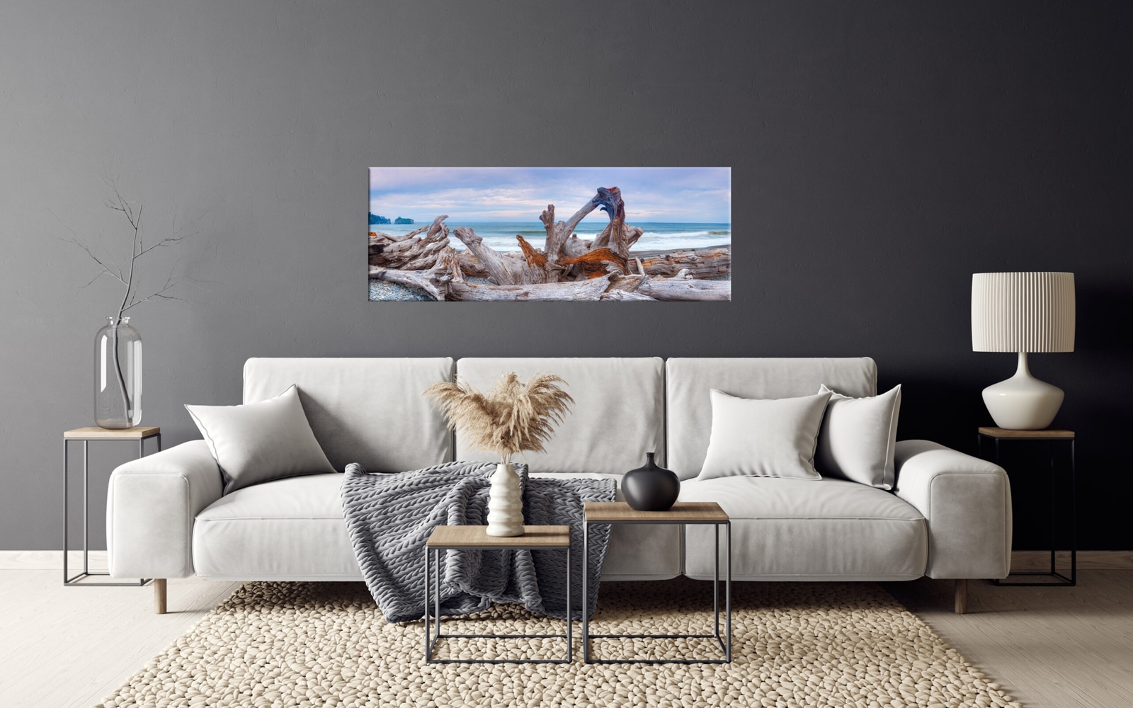 A panoramic photograph of a serene beach scene with a weathered driftwood formation in the foreground and ocean waves in the background under a cloudy sky.
