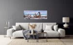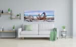 A panoramic canvas print depicting a vibrant turquoise sea with boulders, sailing yachts in the distance, and a clear blue sky.