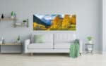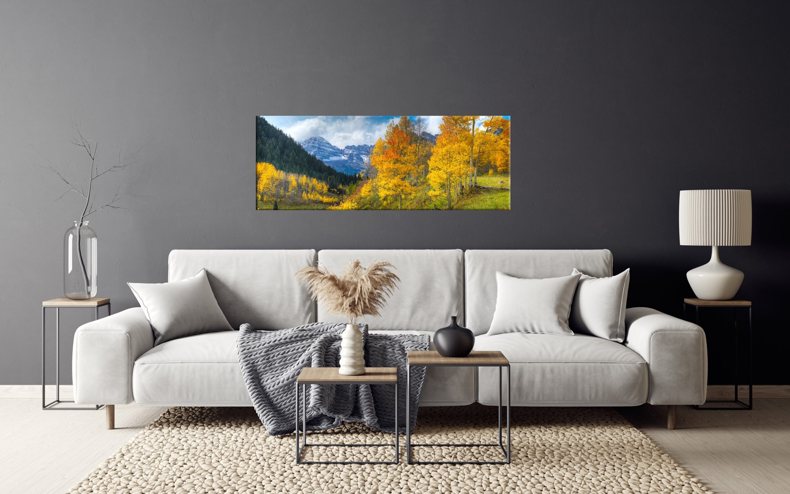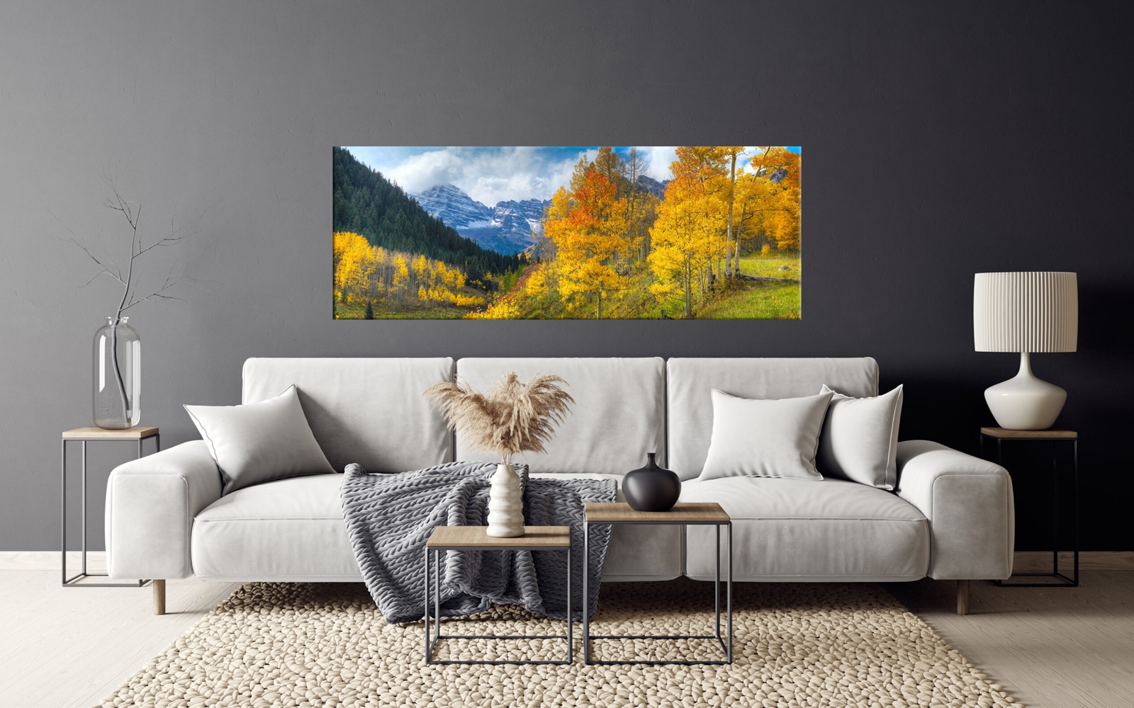 A panoramic landscape photo art of a mountain range with layers of yellow aspen trees in fall color in the foreground.