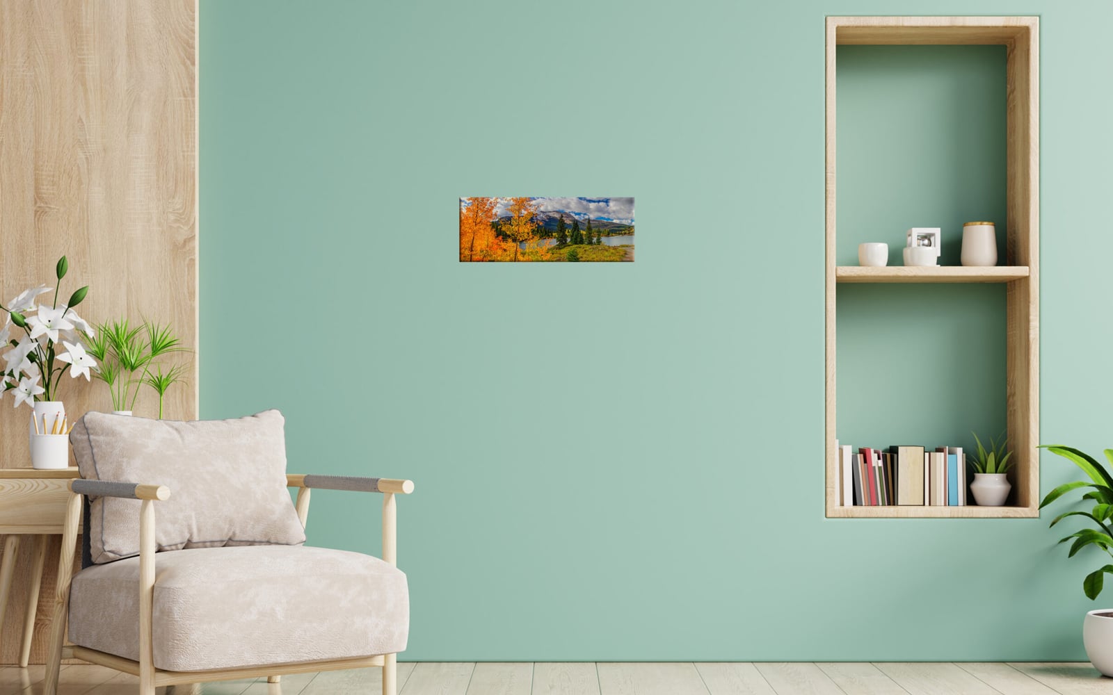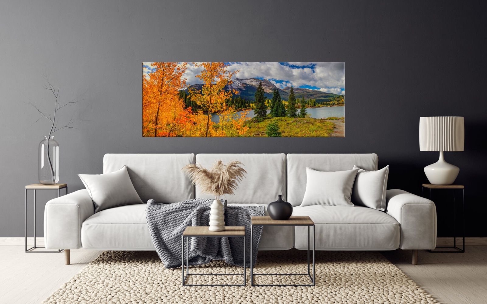 A panoramic autumn landscape with vibrant orange and yellow foliage, a serene lake, pine trees, and a mountain background under a cloudy sky.