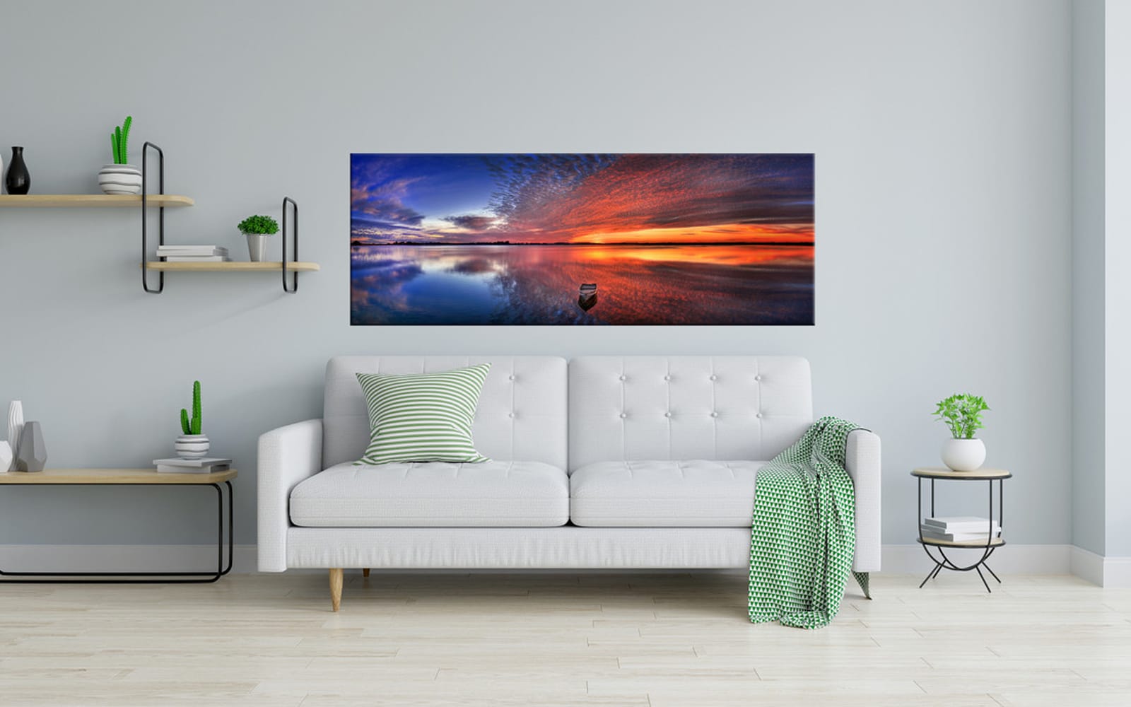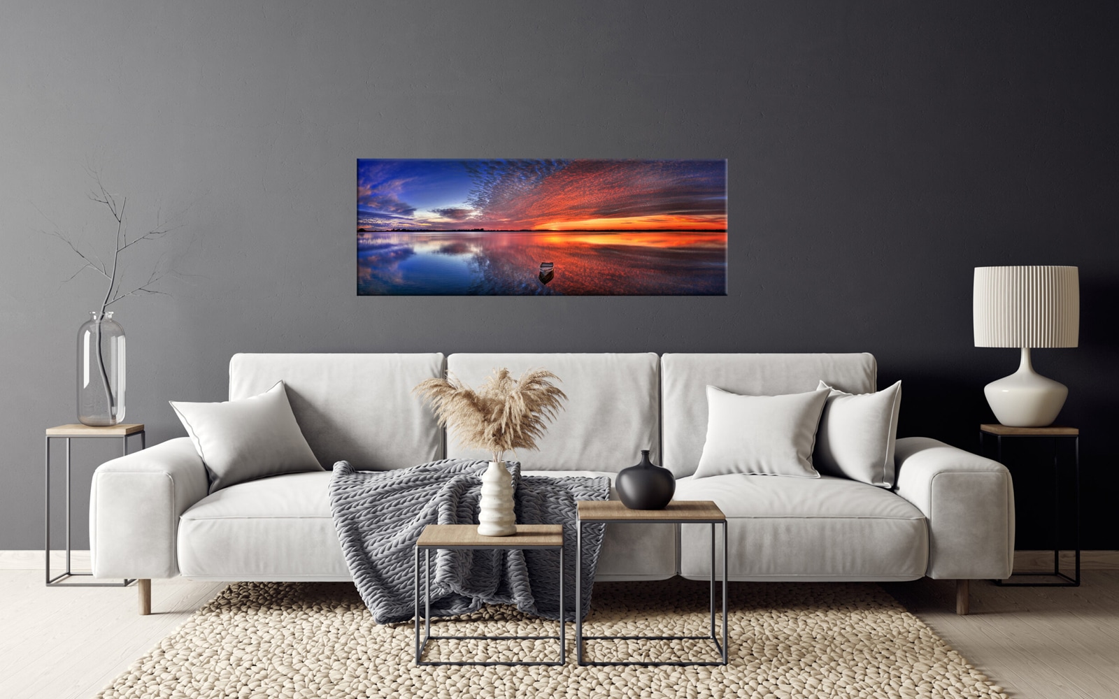 A panoramic painting of a tranquil lake sunset with vibrant sky colors reflected in the water and a lone boat.