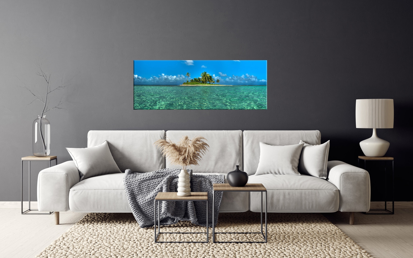 A vibrant art piece depicting a wooden pier leading to a small tropical island with palm trees, a thatched hut, and a clear turquoise ocean under a blue sky with fluffy clouds.