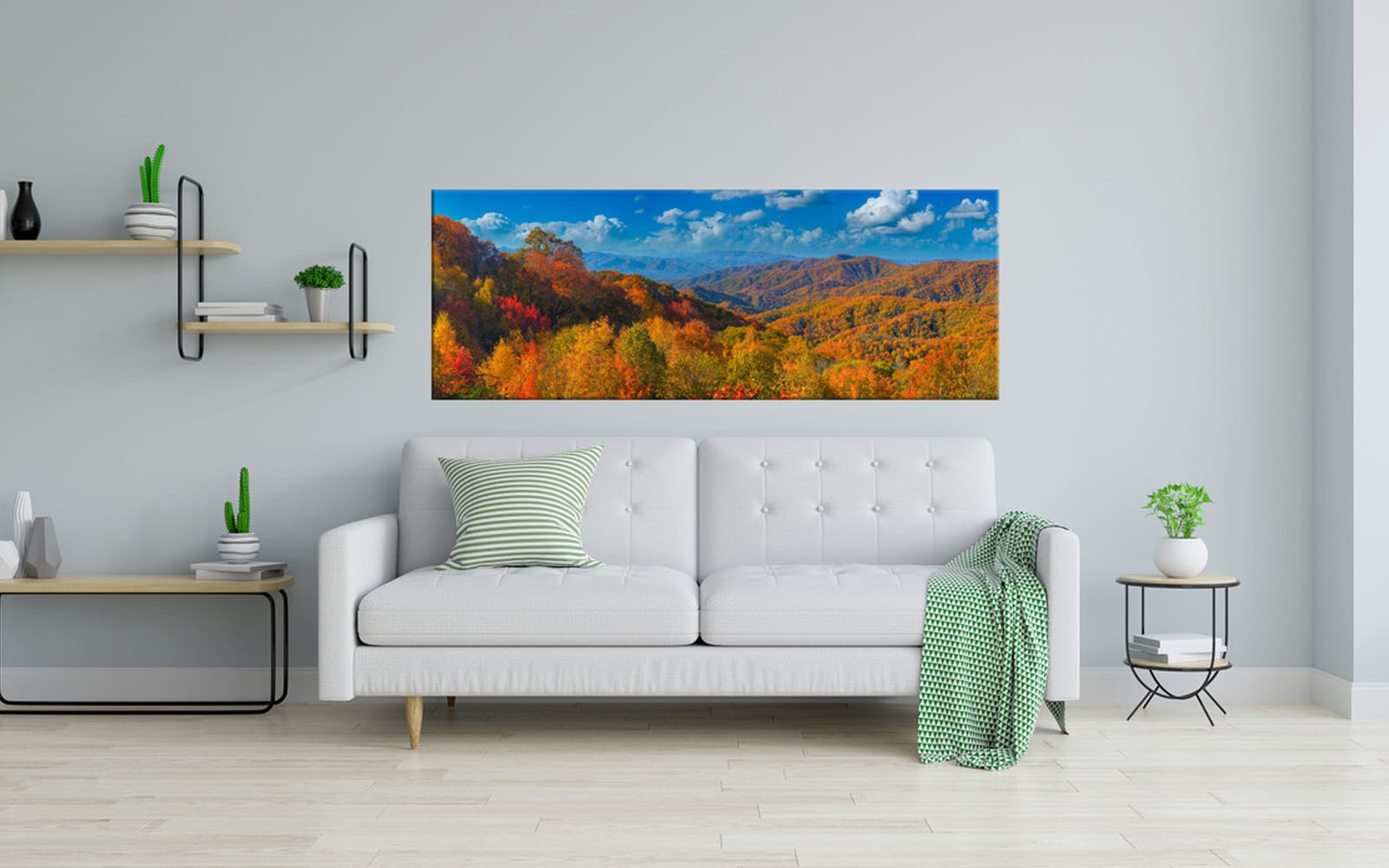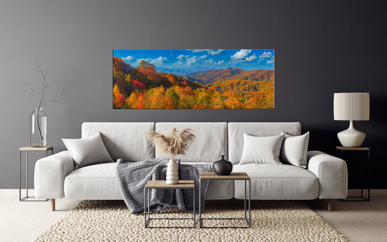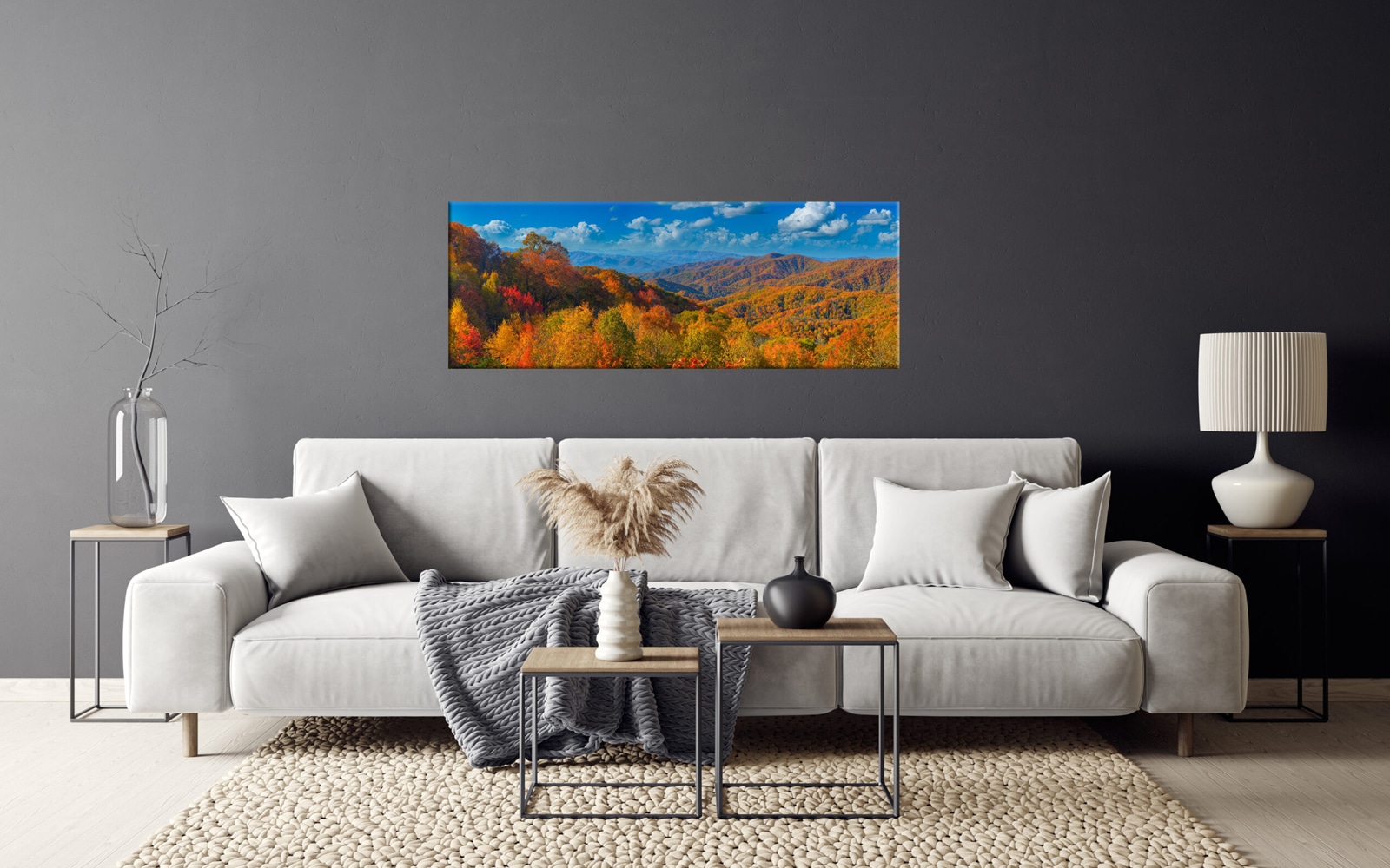 Panoramic autumn landscape with a vibrant display of fall colors on forested mountains under a blue sky with clouds.