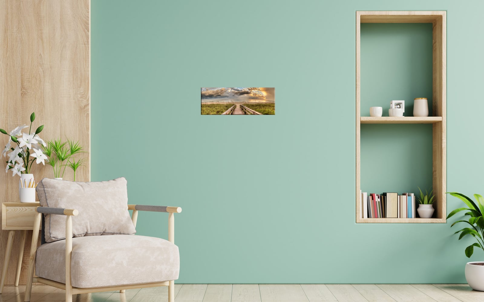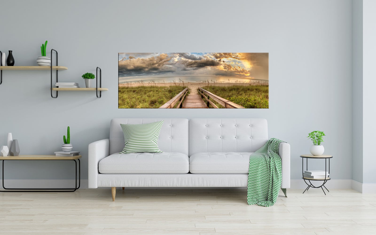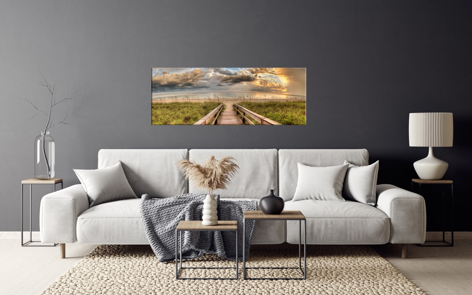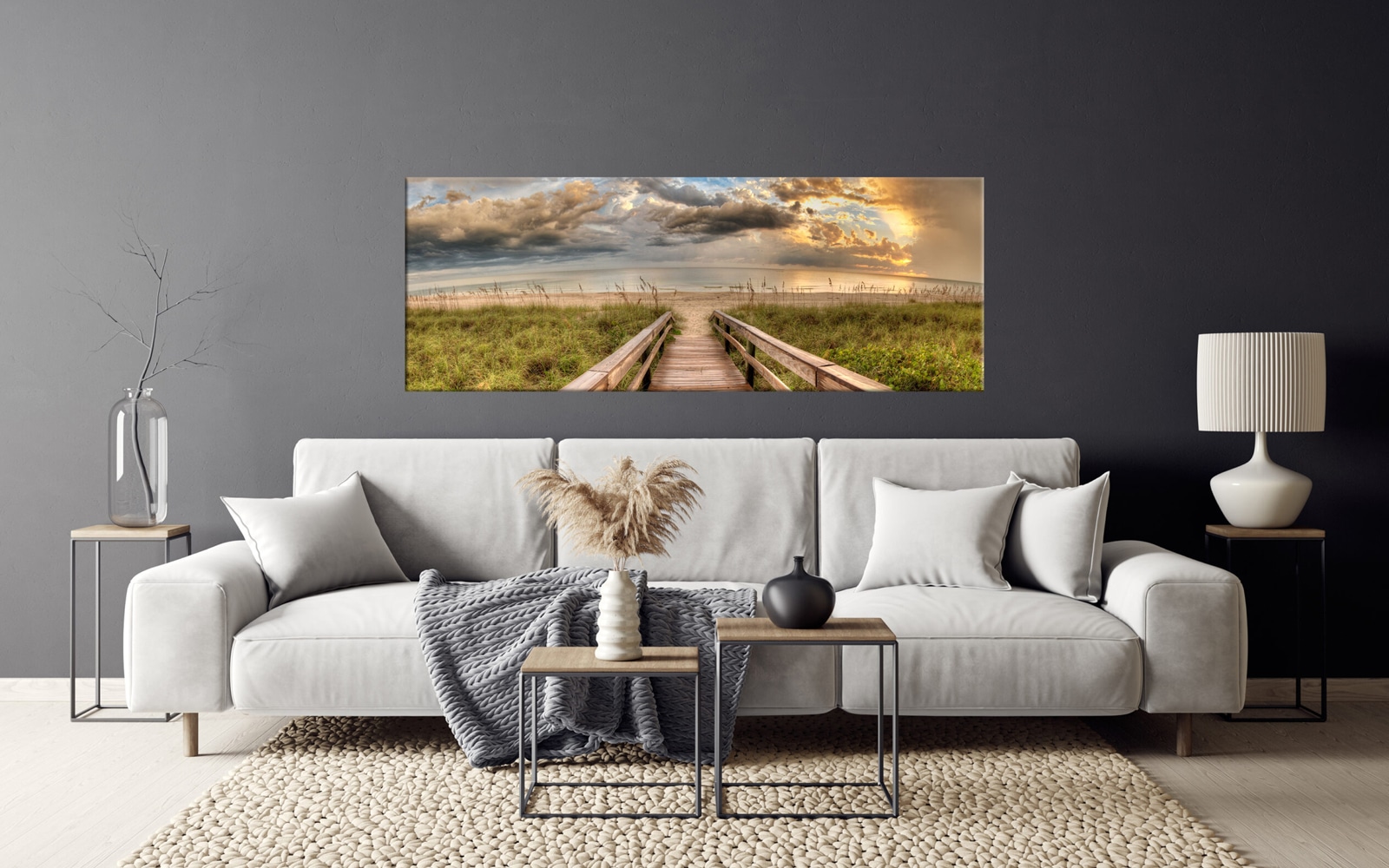 A panoramic art print of a serene beach scene with a wooden path leading to the ocean, featuring lush beach grass, a cloudy sky, and a warm sunset glow.