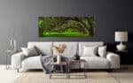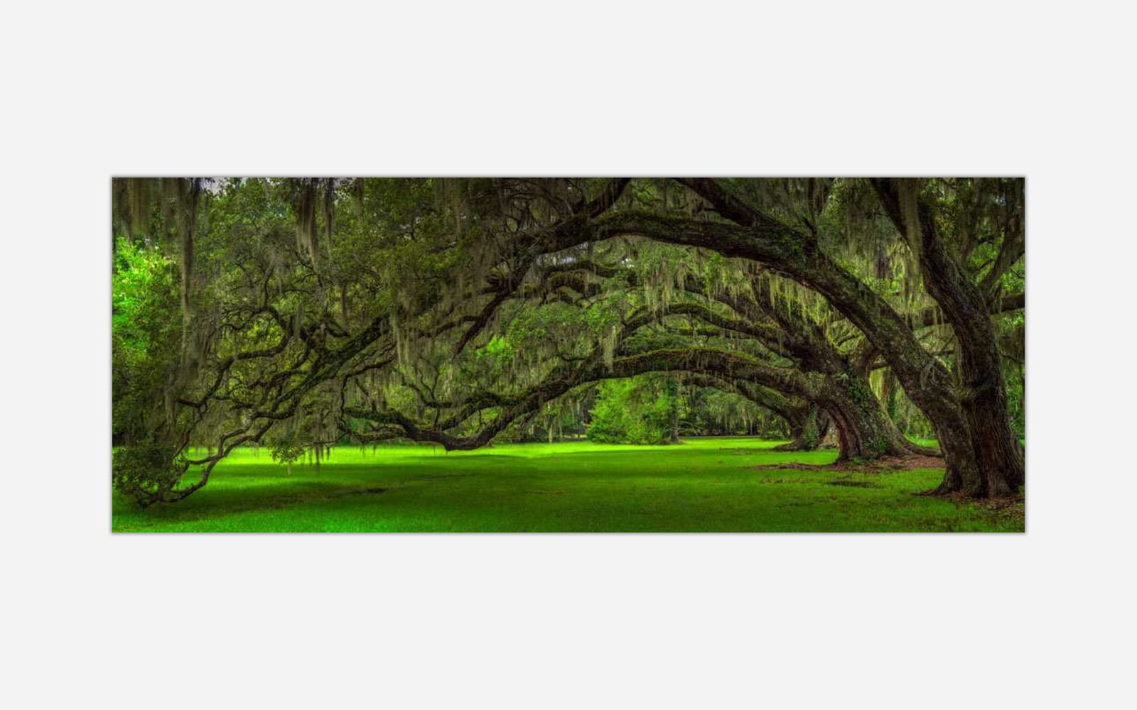 A panoramic photograph of majestic southern live oaks draped with Spanish moss in a lush green setting.