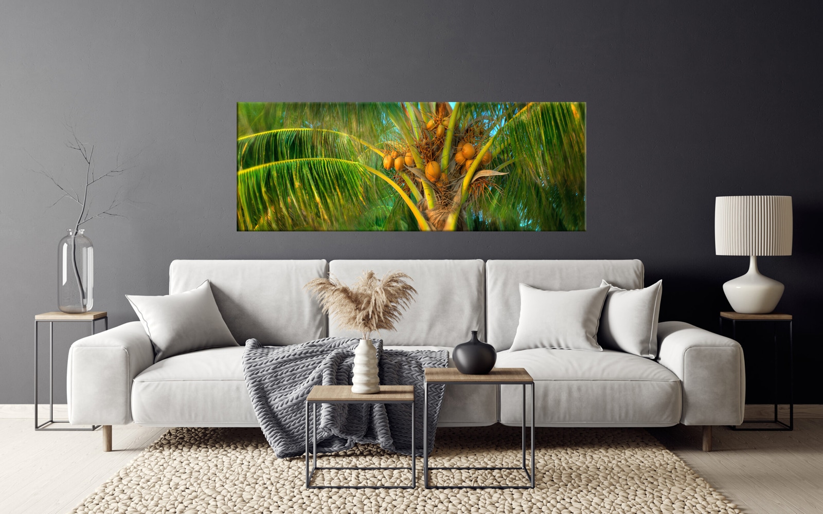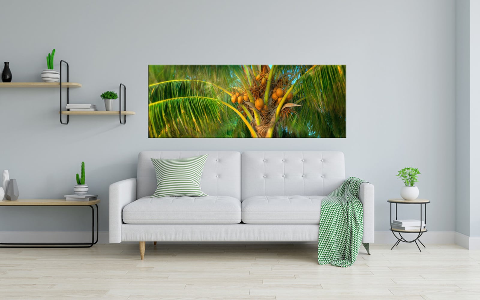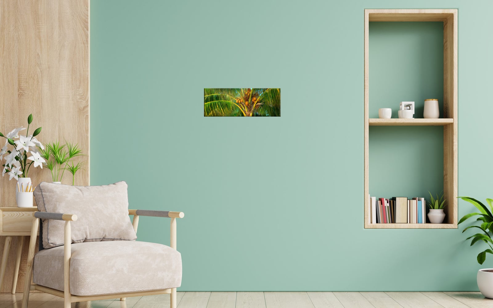 A panoramic canvas art print of a coastal scene with tall palm trees against a bright blue sky, overlooking an ocean with red flowers in the foreground.