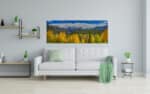 A panoramic landscape photo art of a mountain range with layers of yellow aspen trees in fall color in the foreground.