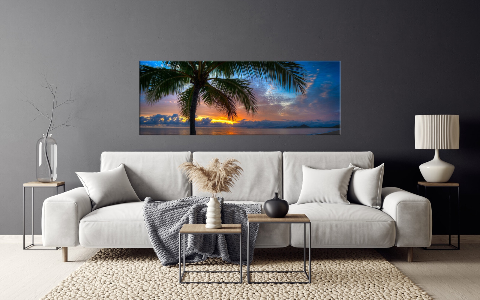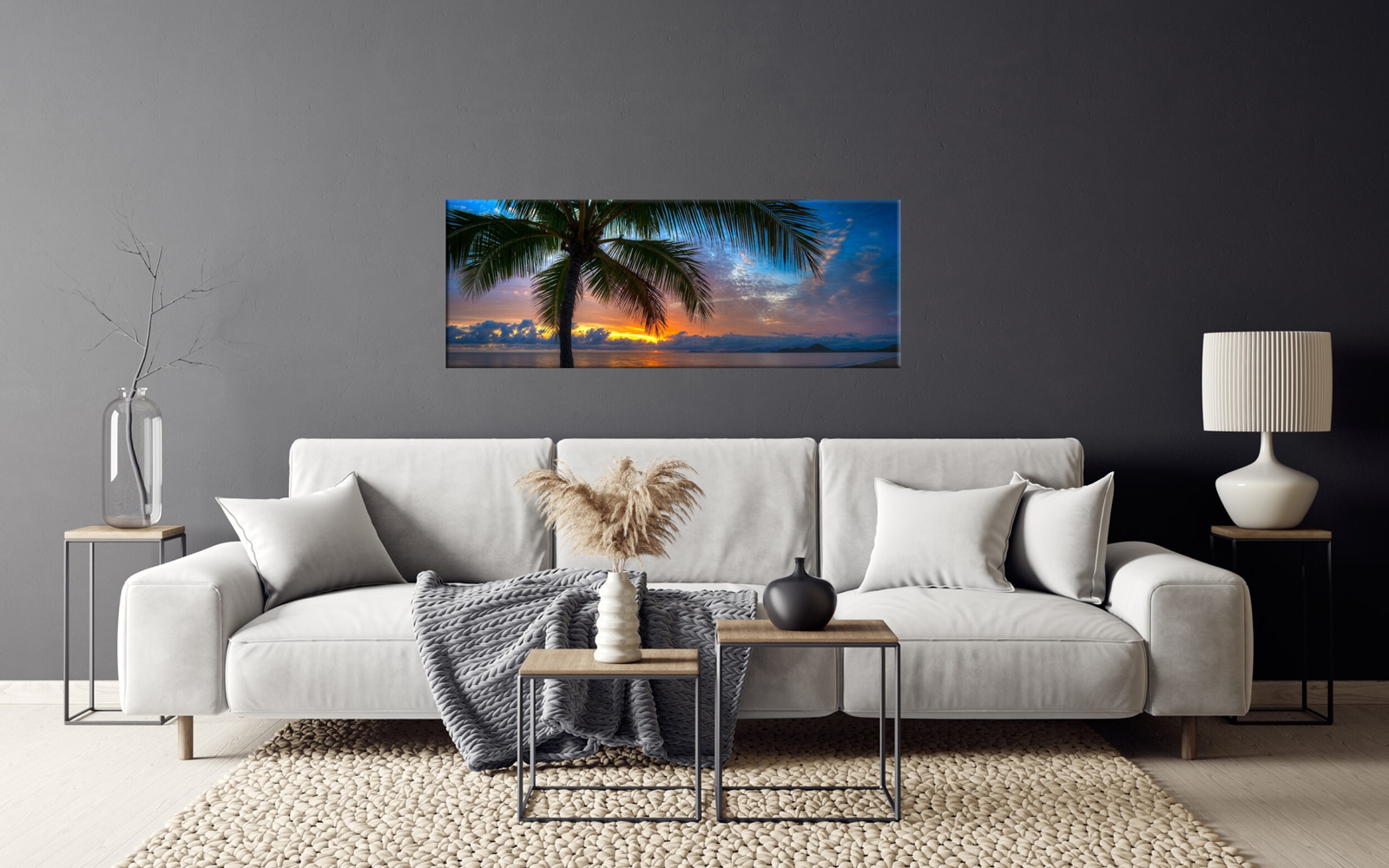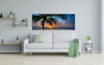 A vibrant art print of a tropical beach sunset with silhouetted palm trees against a colorful sky.