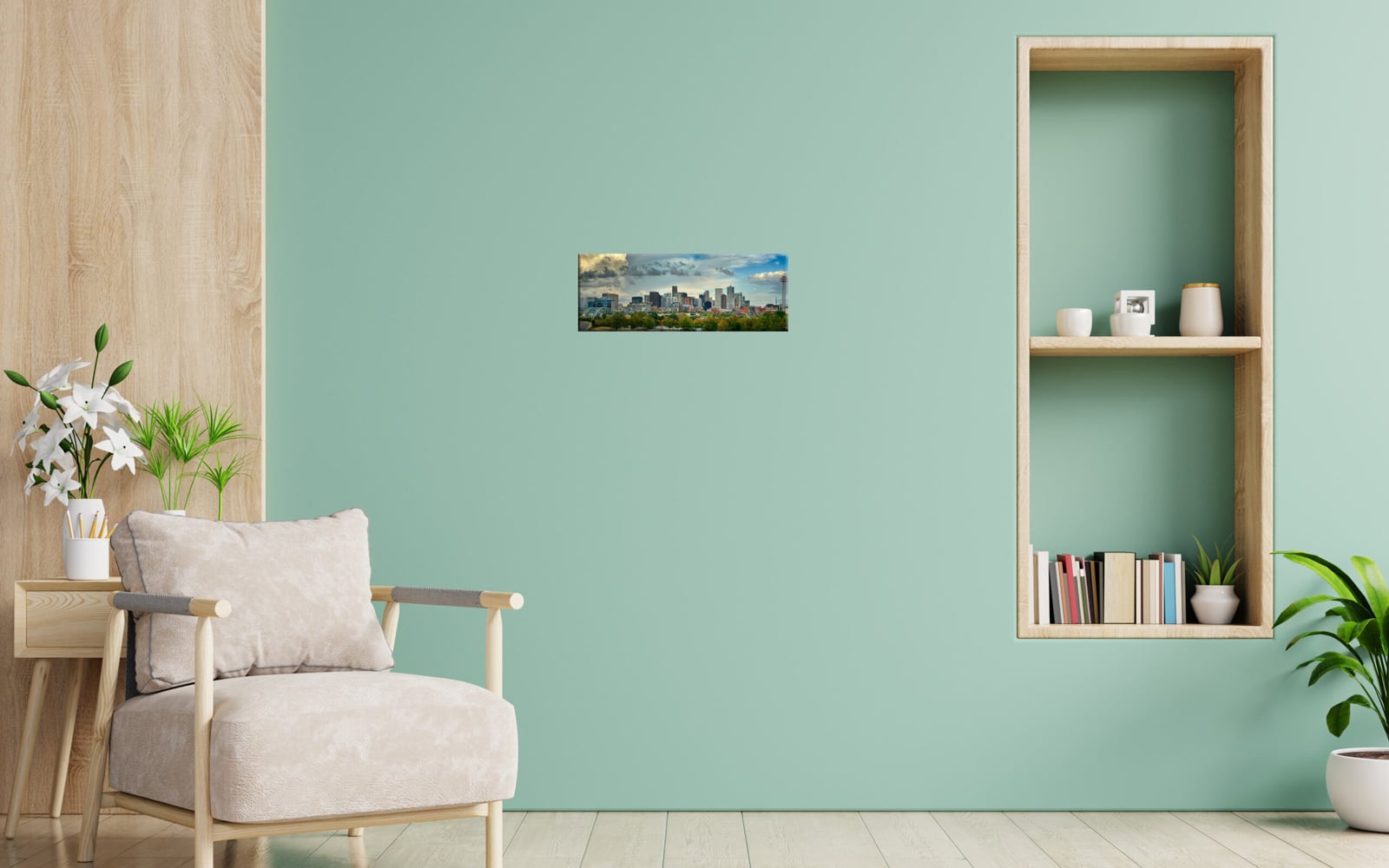A panoramic photograph of a modern city skyline with skyscrapers, dynamic clouds overhead, and greenery in the foreground.