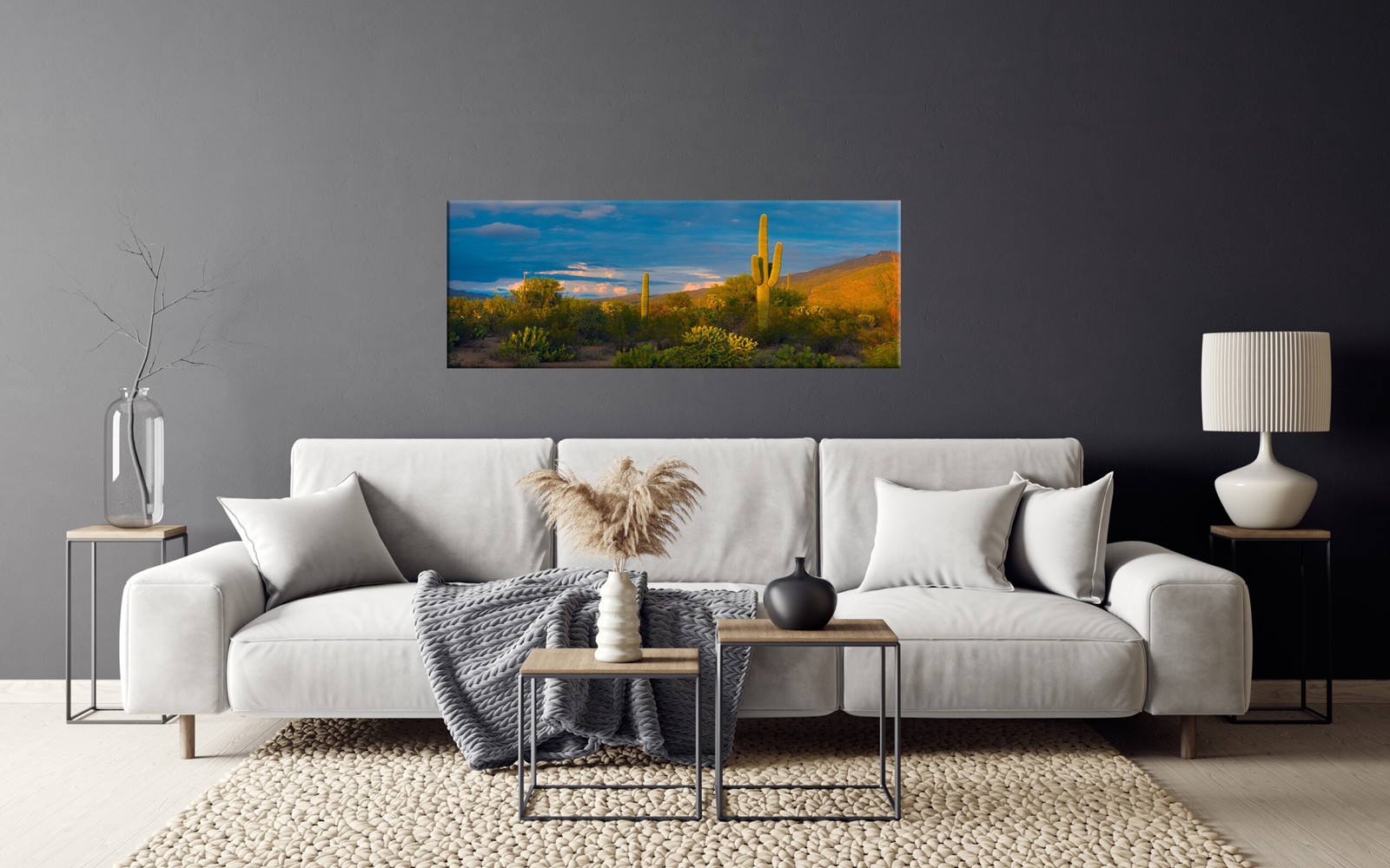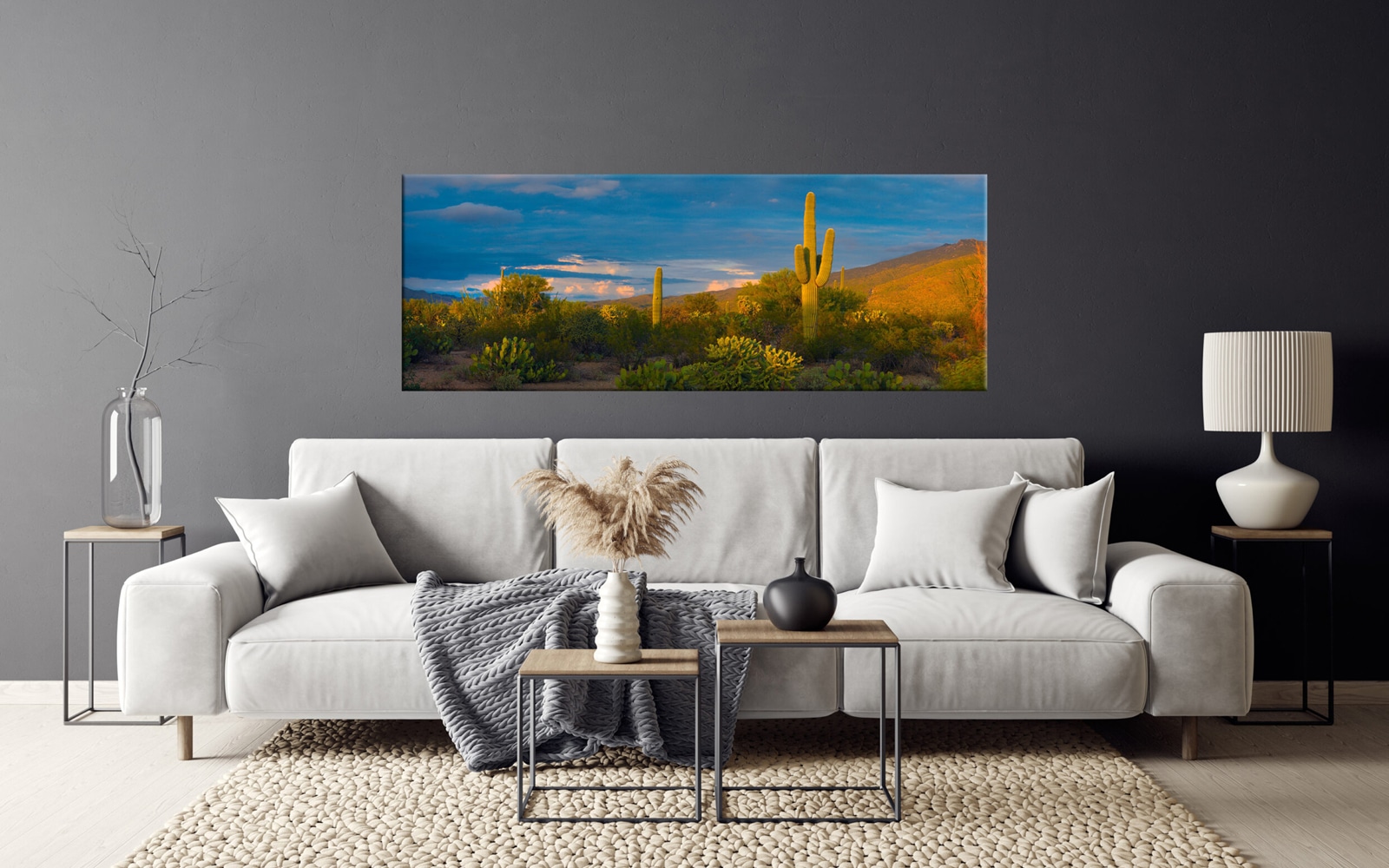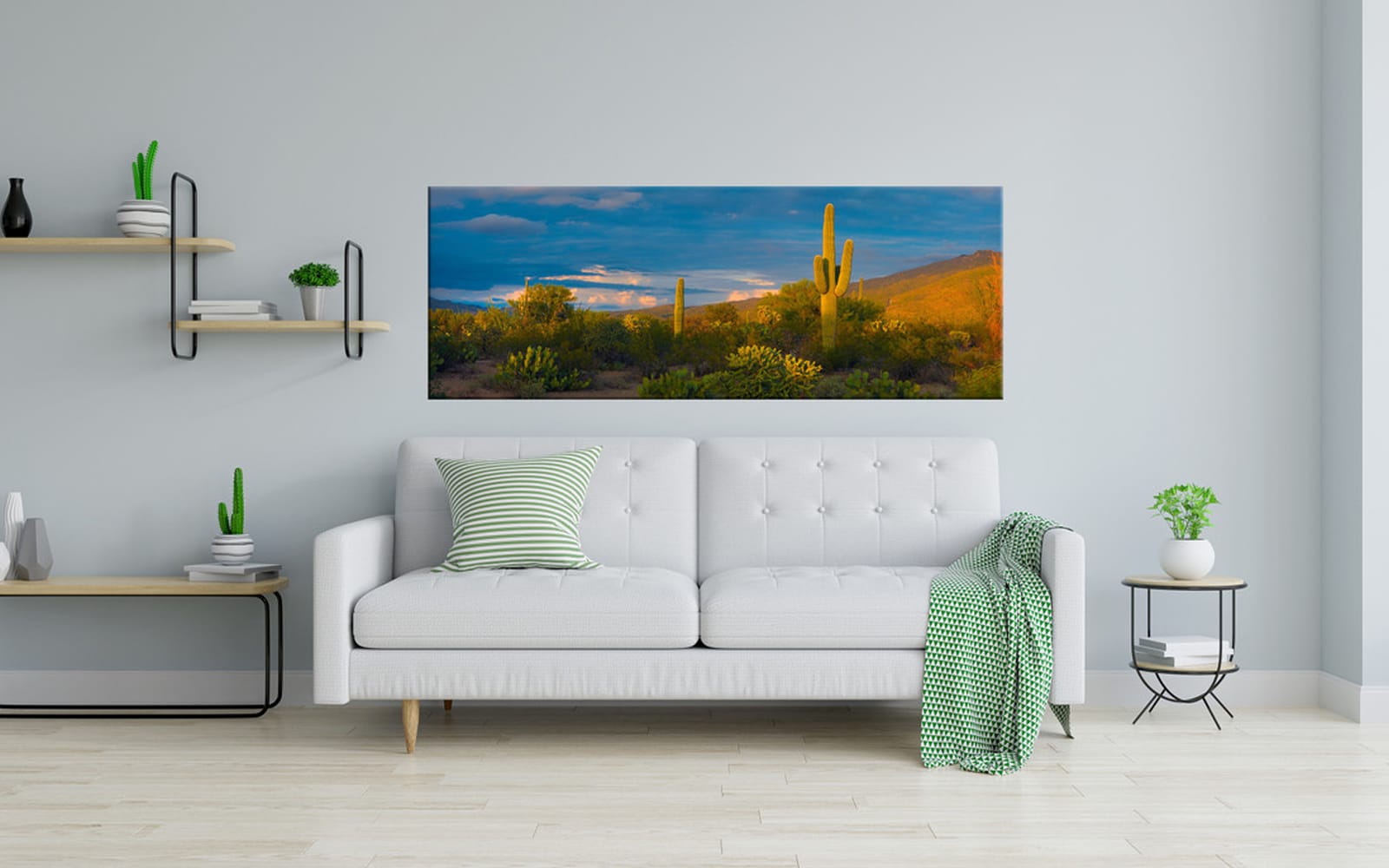 A panoramic photograph of a desert landscape at sunset featuring towering saguaro cacti, lush desert vegetation, and a mountain backdrop under a sky with clouds illuminated by the setting sun.