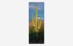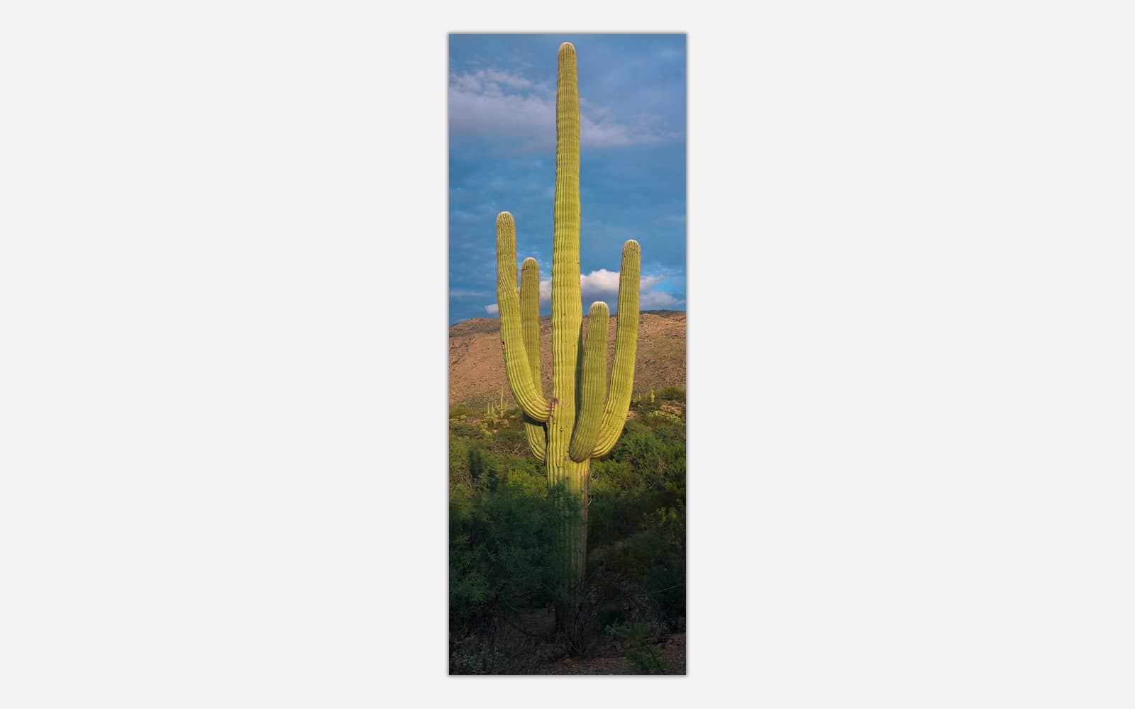 A panoramic photograph of a desert landscape at sunset featuring towering saguaro cacti, lush desert vegetation, and a mountain backdrop under a sky with clouds illuminated by the setting sun.