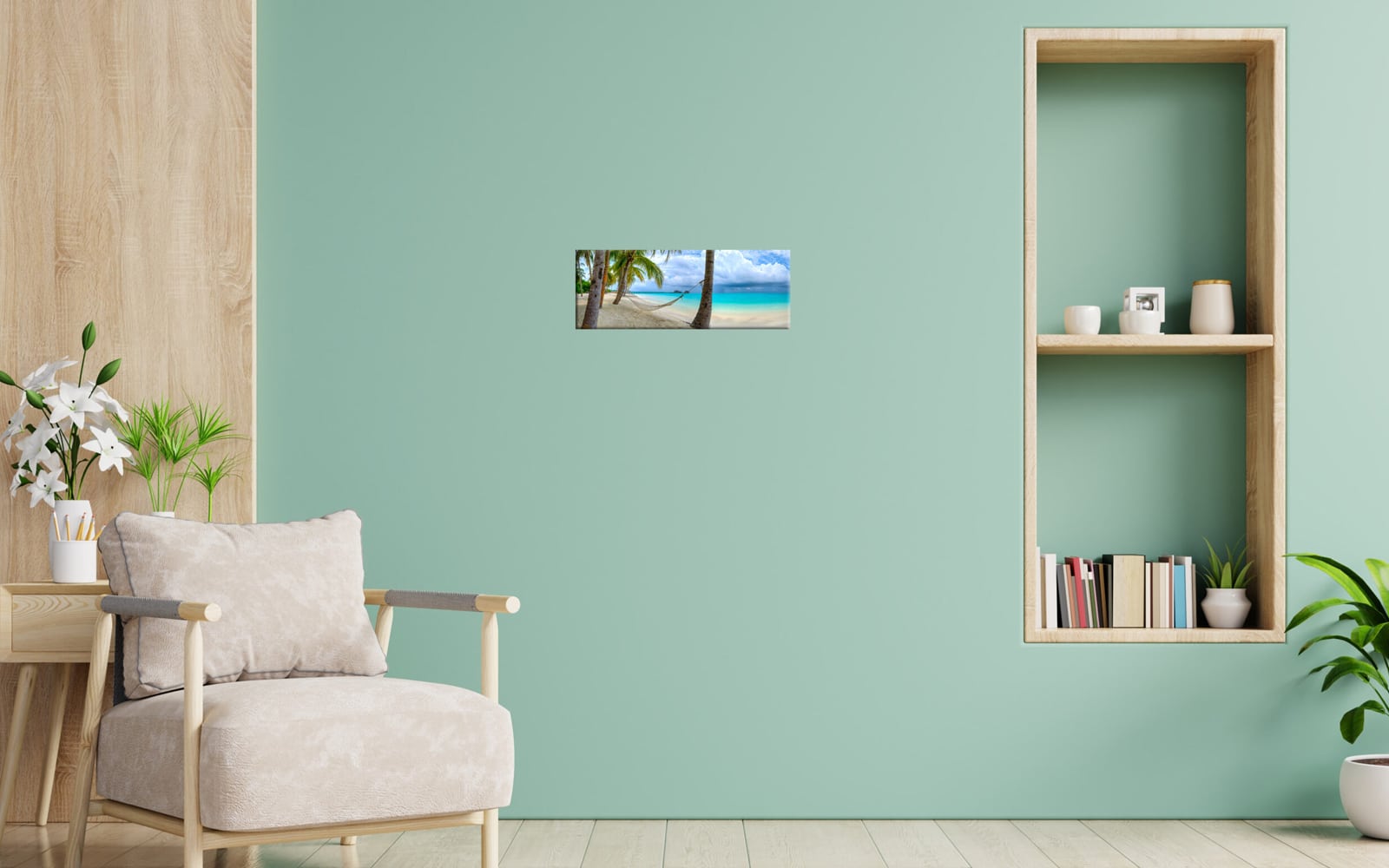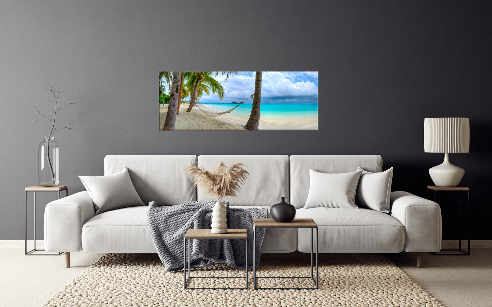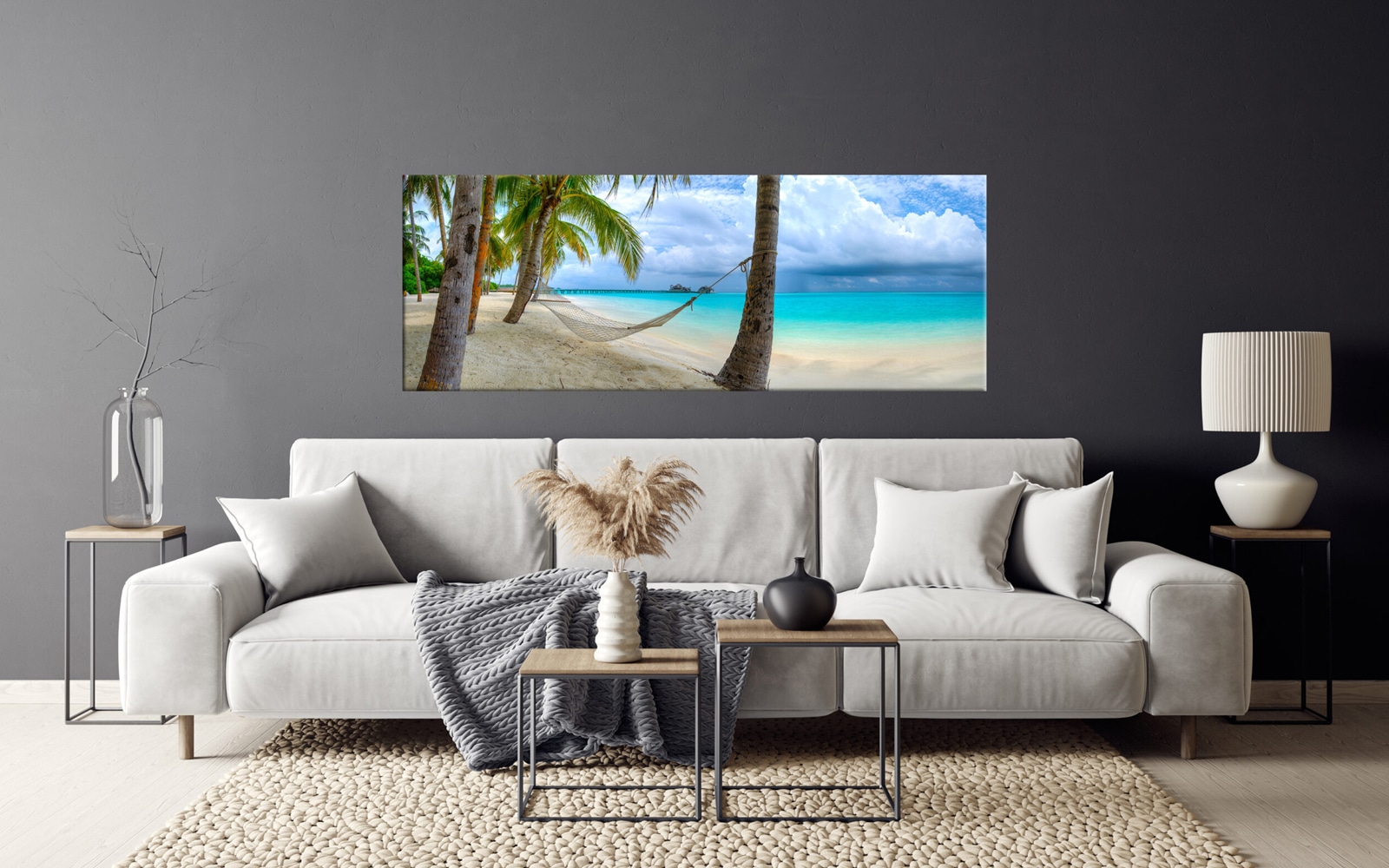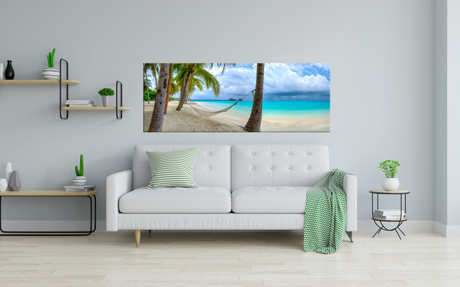 A panoramic wall art of a hammock tied between two palm trees over crystal clear turquoise water under a blue sky with fluffy clouds.