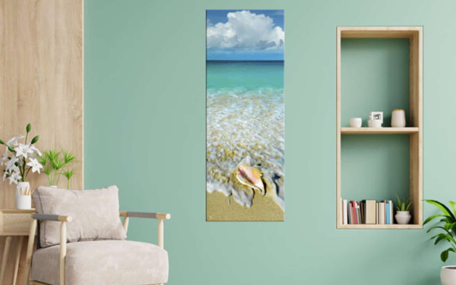 A panoramic artwork of a tranquil beach scene with a hammock tied between two palm trees, turquoise ocean water, white sand, and a cloudy sky.