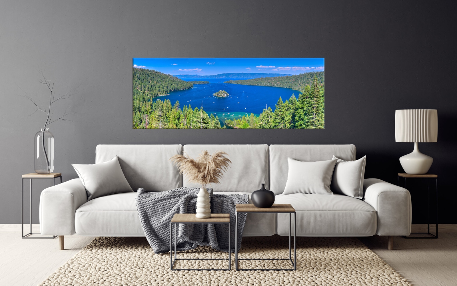 Panoramic view of the blue waters of Lake Tahoe with surrounding green forests and mountain ranges under a clear sky.
