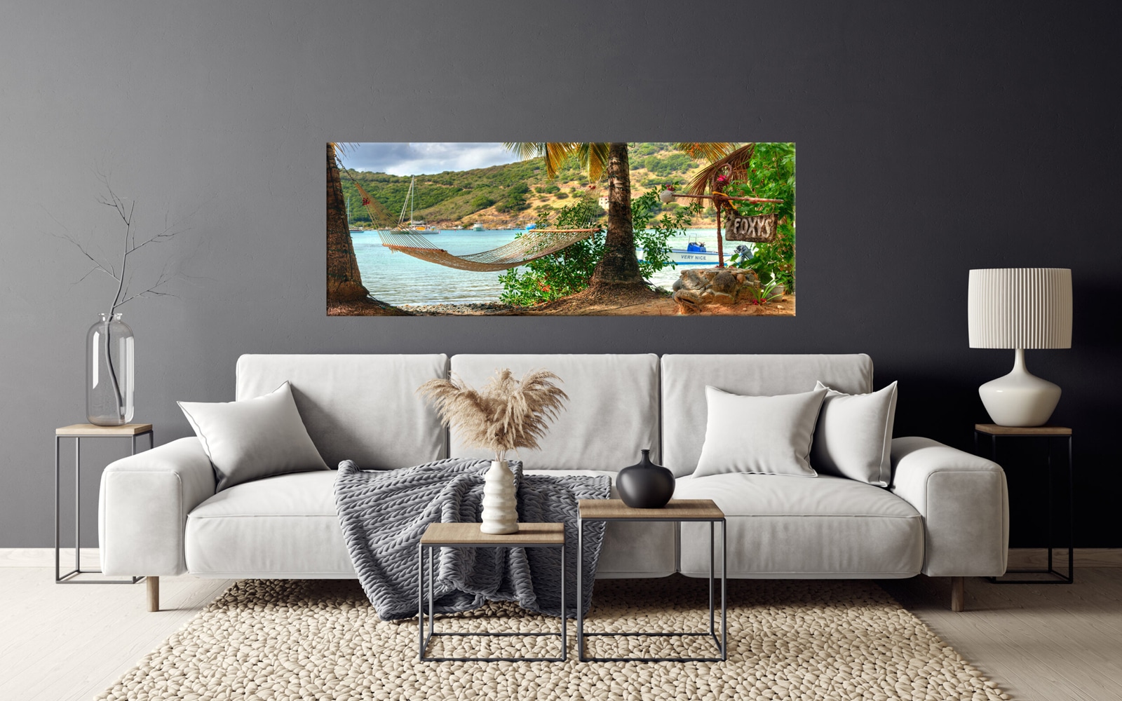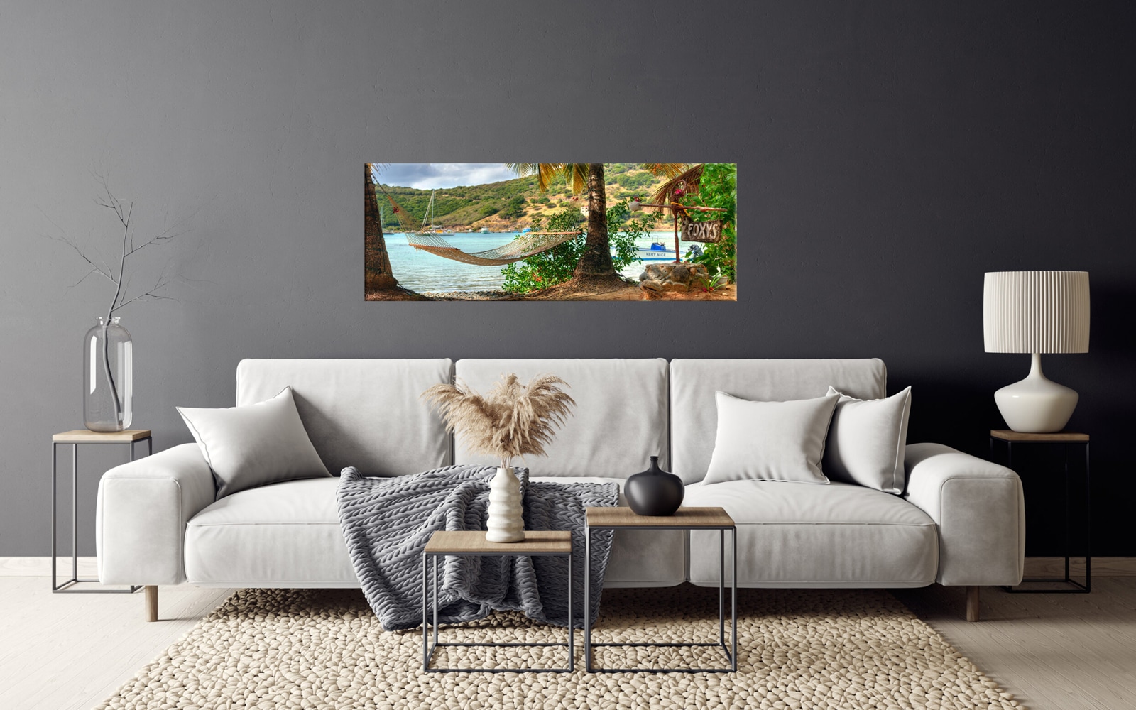 A panoramic wall art of a hammock tied between two palm trees over crystal clear turquoise water under a blue sky with fluffy clouds.