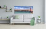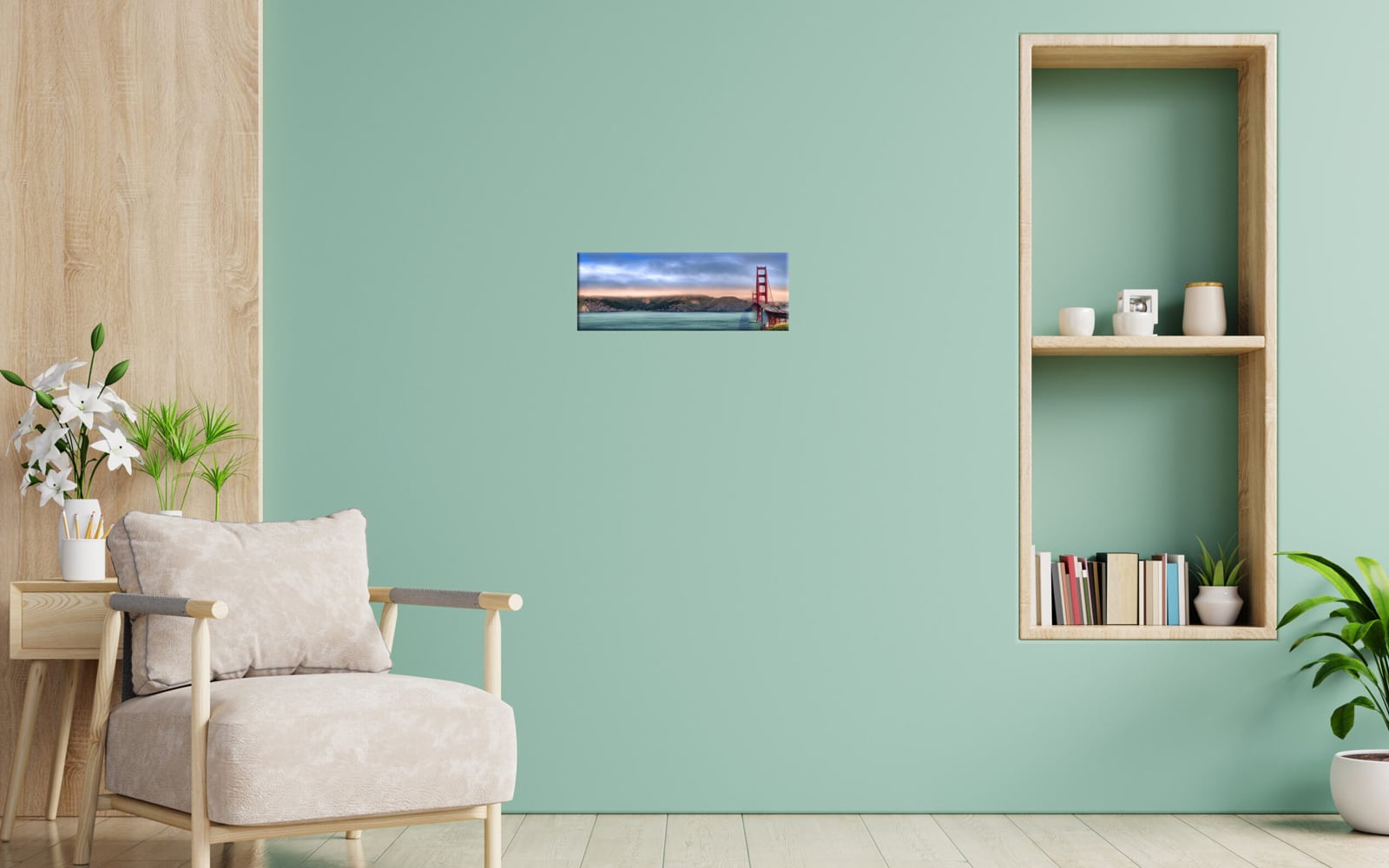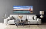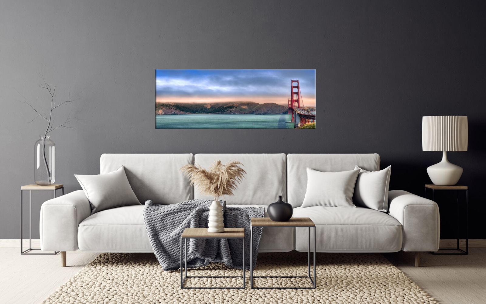 A panoramic wall art canvas featuring the Golden Gate Bridge in San Francisco during sunset with warm lighting and coastal elements.