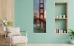 A panoramic wall art canvas featuring the Golden Gate Bridge in San Francisco during sunset with warm lighting and coastal elements.