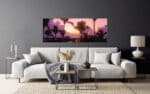 A scenic photograph of a tropical sunset with silhouetted palm trees against a vibrant purple sky over a calm ocean.