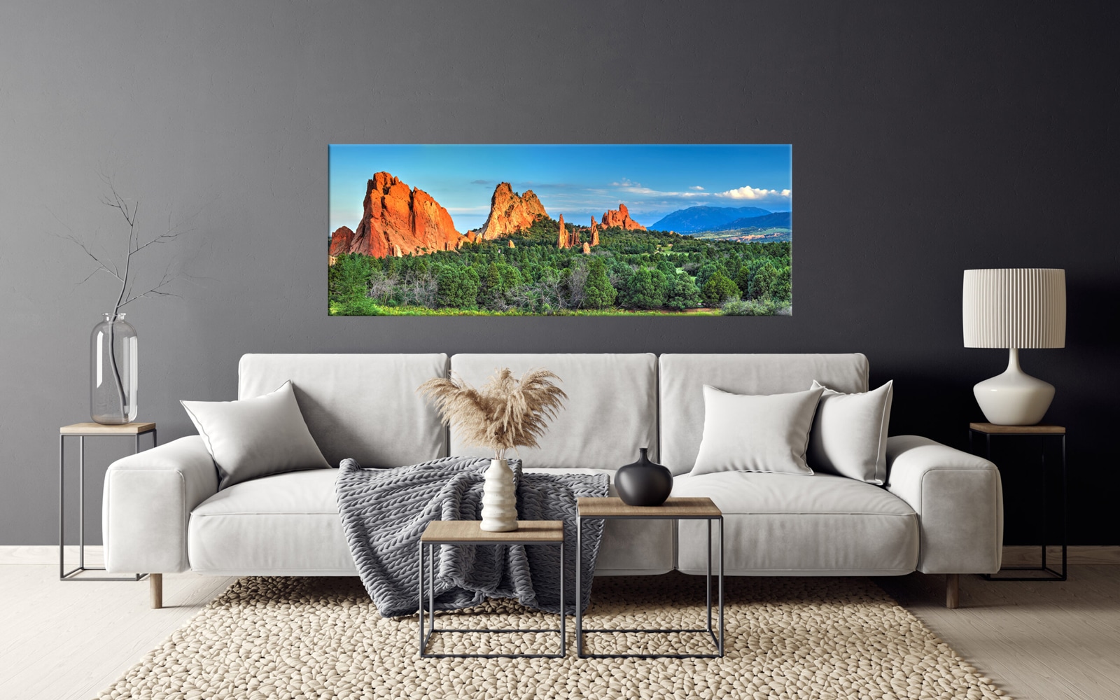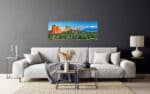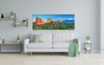 A panoramic landscape photo of majestic orange rock formations against a blue sky with lush greenery in the foreground.
