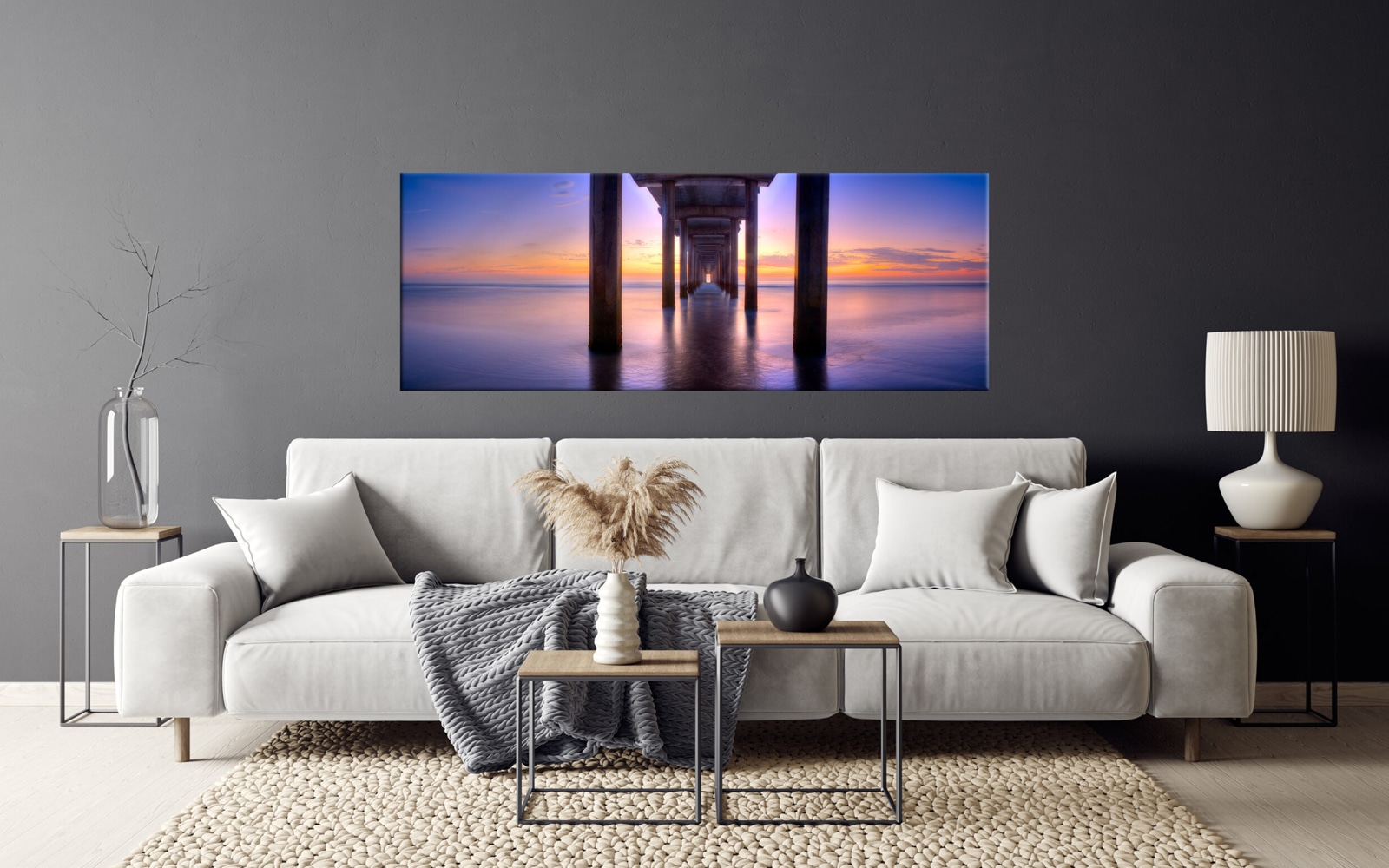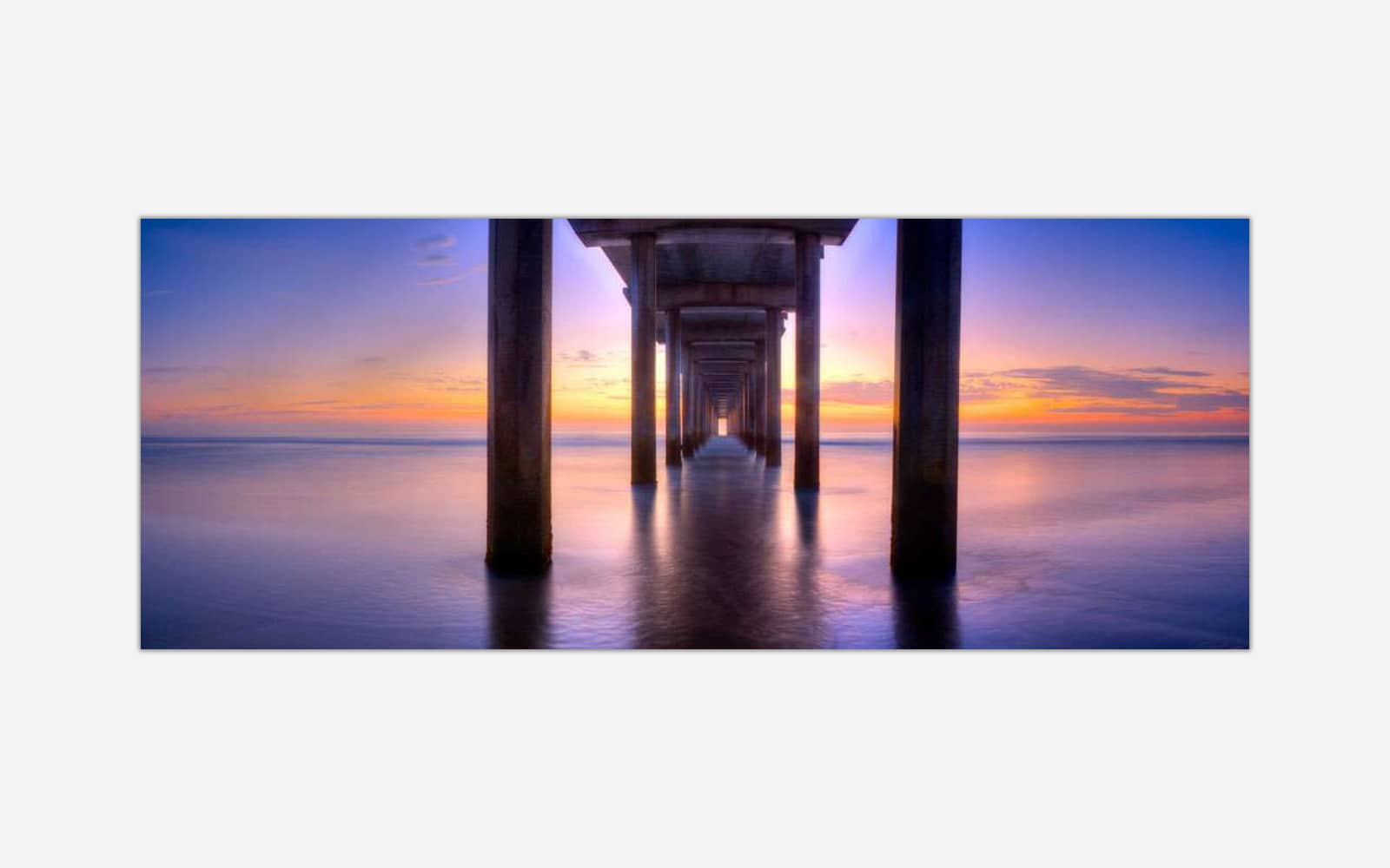 Underneath a pier with calm waters and a vibrant sunset sky in the background, creating a serene and tranquil atmosphere.