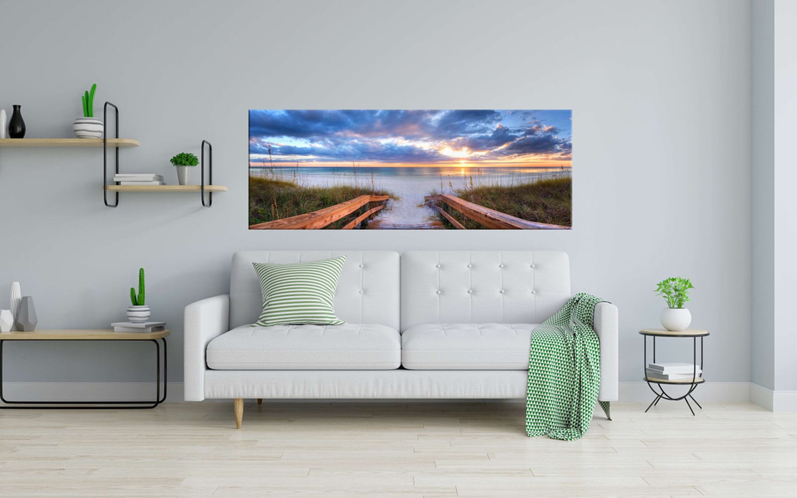 A canvas print of a tranquil beach scene at sunset with a wooden pathway leading through dunes to the shore, with vibrant colors in the sky and reflections on the water.
