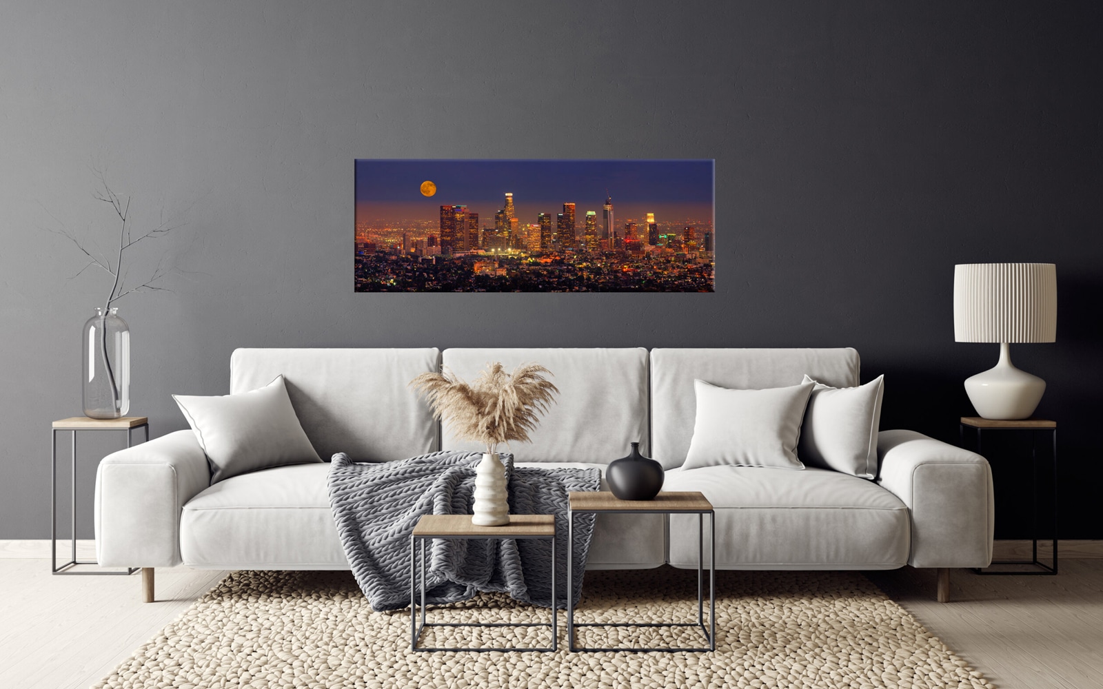 A panoramic view of an illuminated city skyline at night with a full moon in the sky.