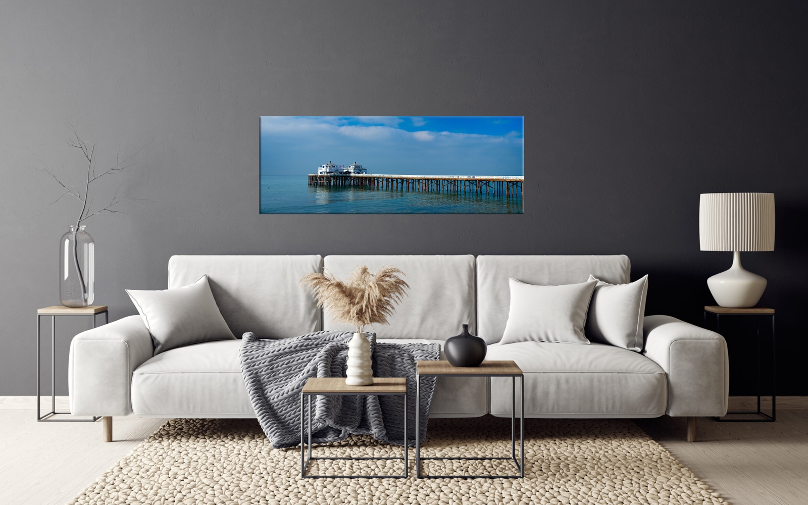 A photograph of a long wooden pier extending into the calm blue ocean under a clear sky.
