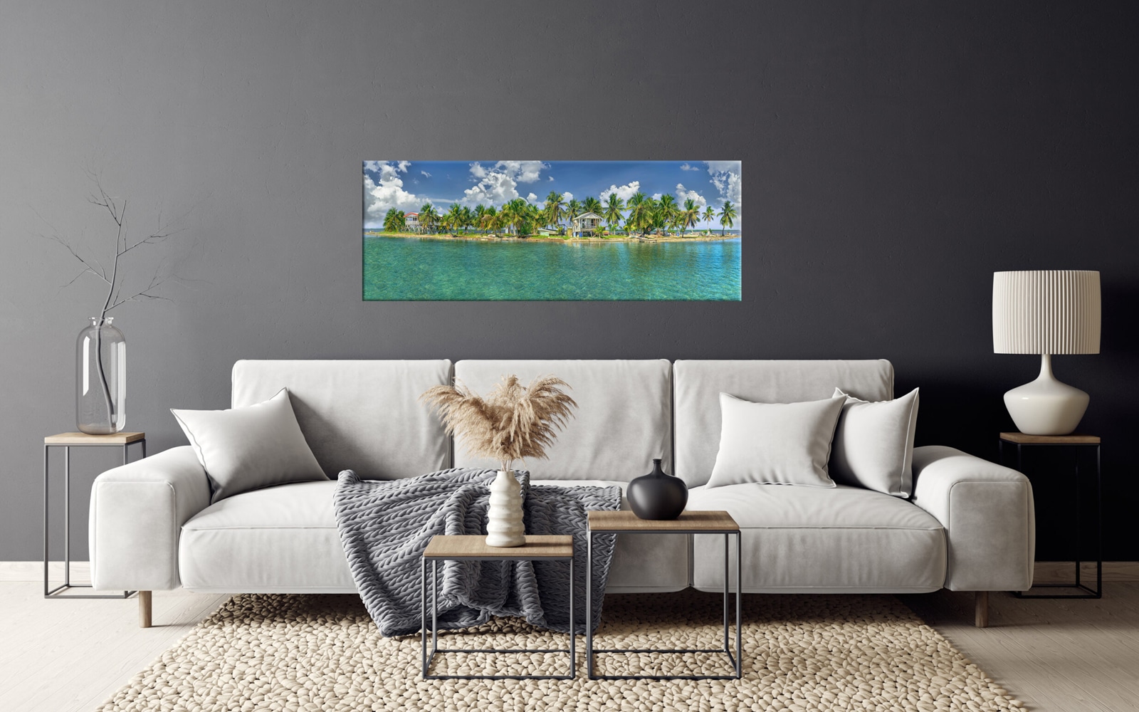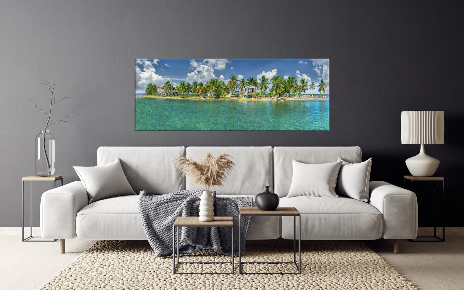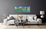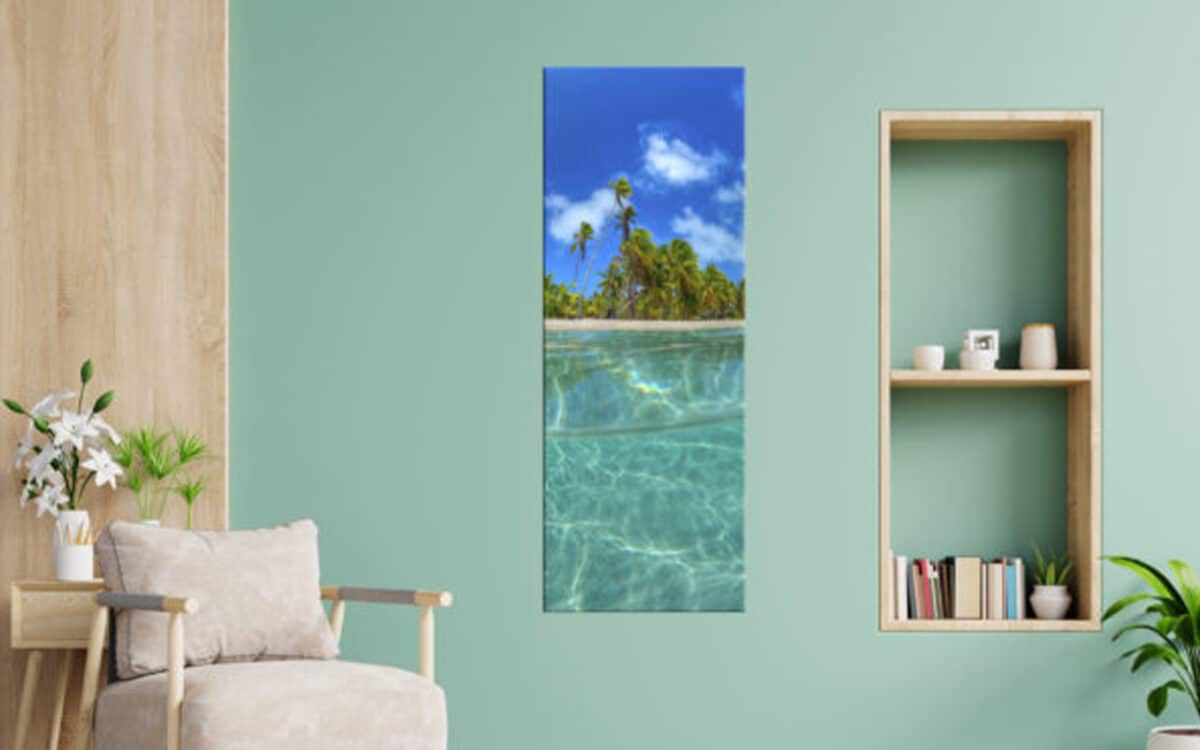 A panoramic art print featuring a pristine tropical beach with clear turquoise waters, lush palm trees, and a sunny blue sky.
