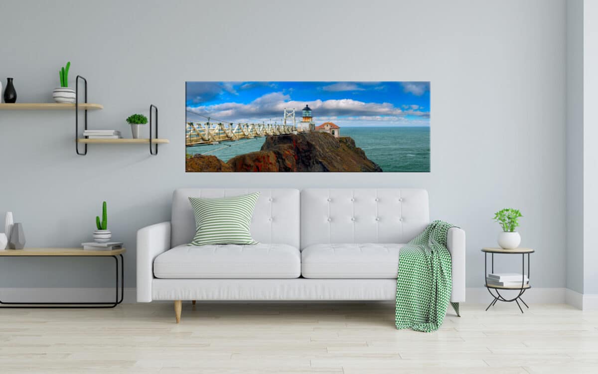 A panoramic art piece depicting a historic lighthouse on a rocky coastline with a footbridge leading up to it under a dynamic sky with scattered clouds.
