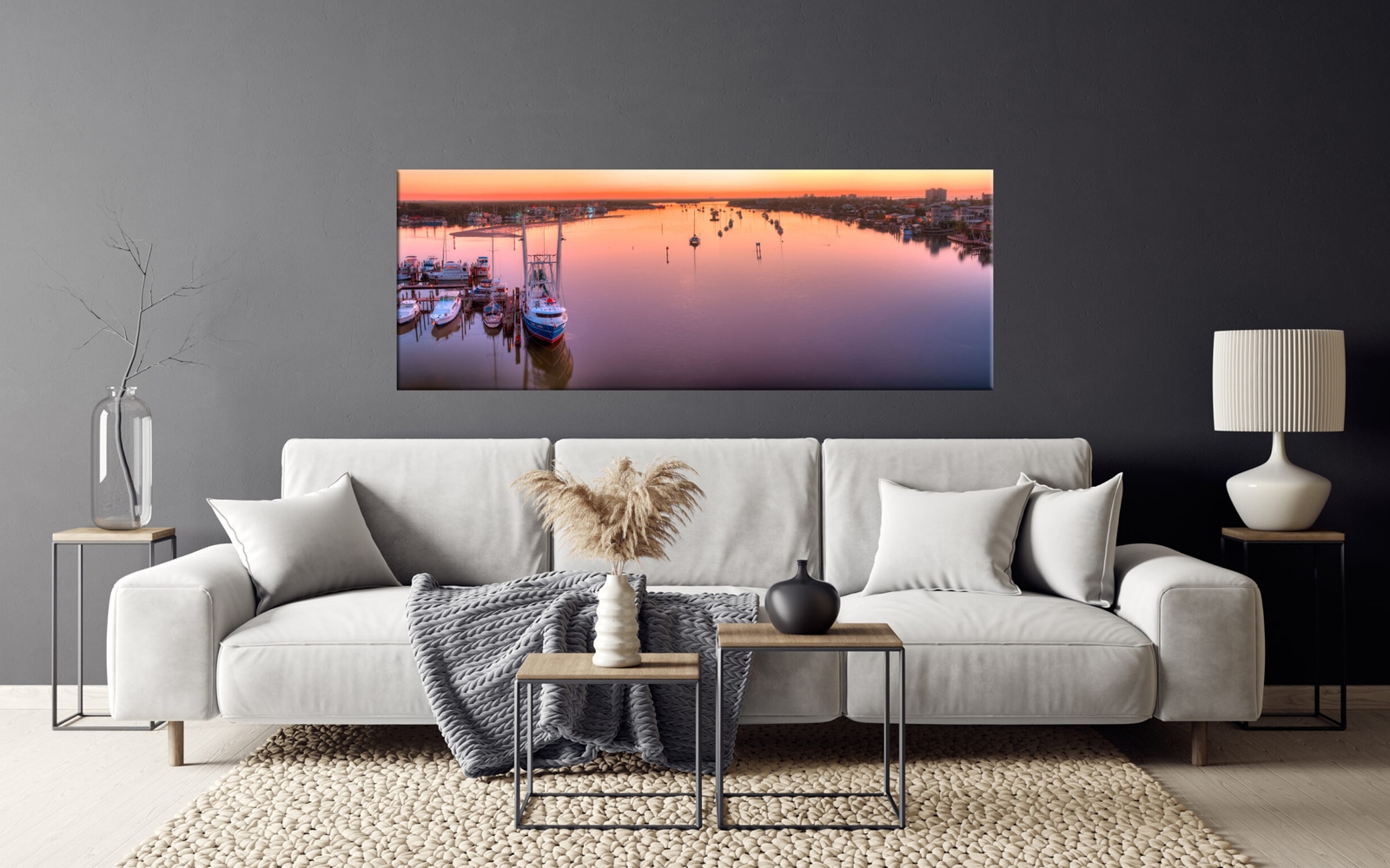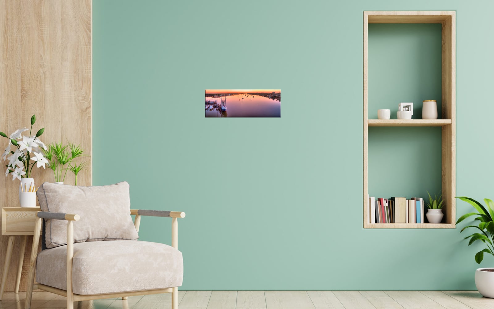 An artwork featuring a peaceful sunset at a marina with multiple boats docked and reflections on calm water, colorful sky in the background, and coastal houses along the shoreline.