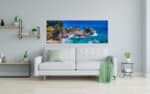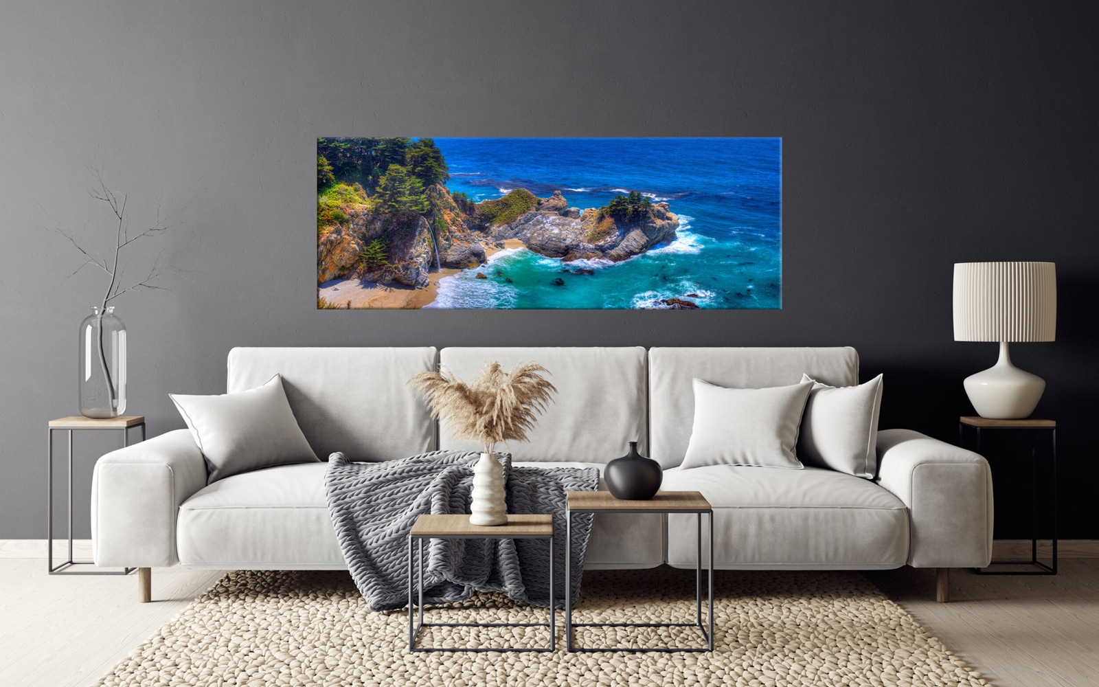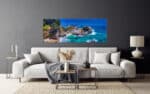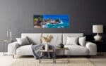 A panoramic art print featuring a pristine tropical beach with clear turquoise waters, lush palm trees, and a sunny blue sky.
