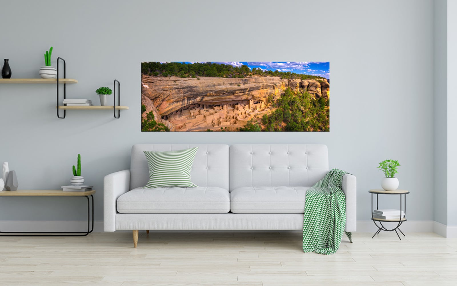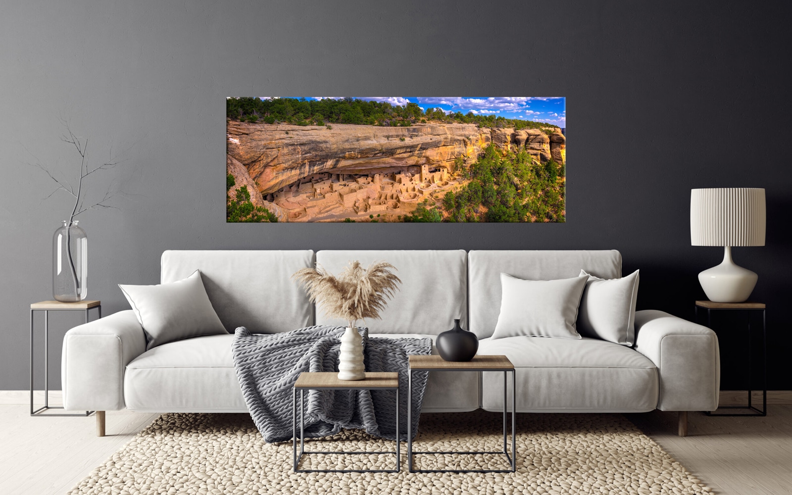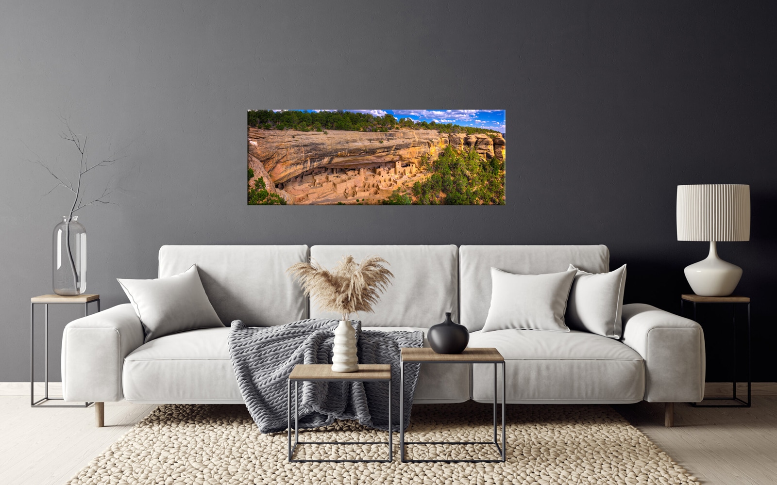 A panoramic photograph of the ancient cliff dwellings at Mesa Verde National Park, showcasing the intricate structures and surrounding natural environment.