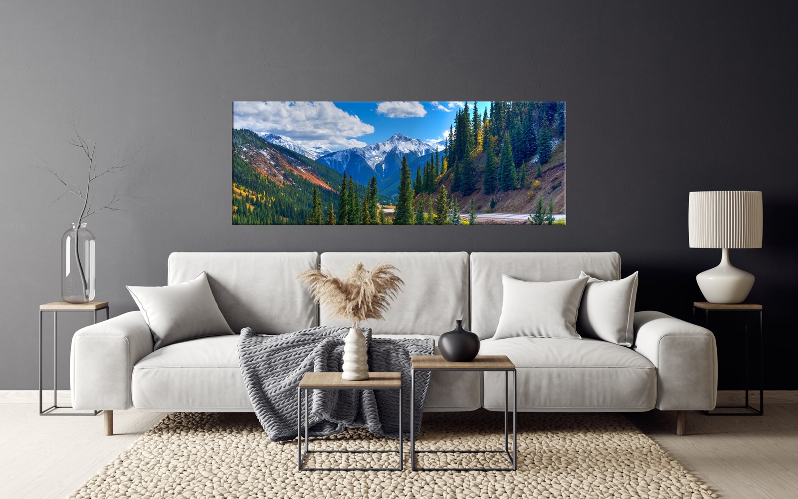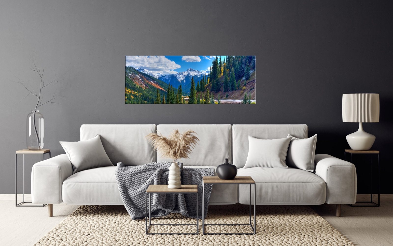 Alt text: A vibrant landscape painting featuring a scenic mountain view with snowy peaks, evergreen pine trees, and autumn colored foliage under a blue sky with clouds.