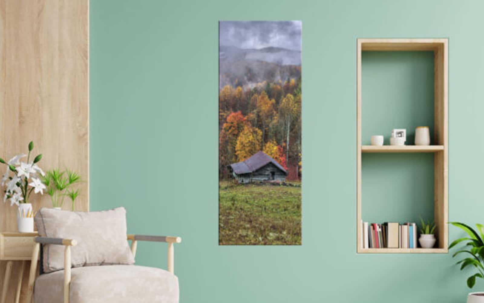 An image of a rustic cabin in a forest during autumn with vibrant fall foliage and misty mountains in the background.