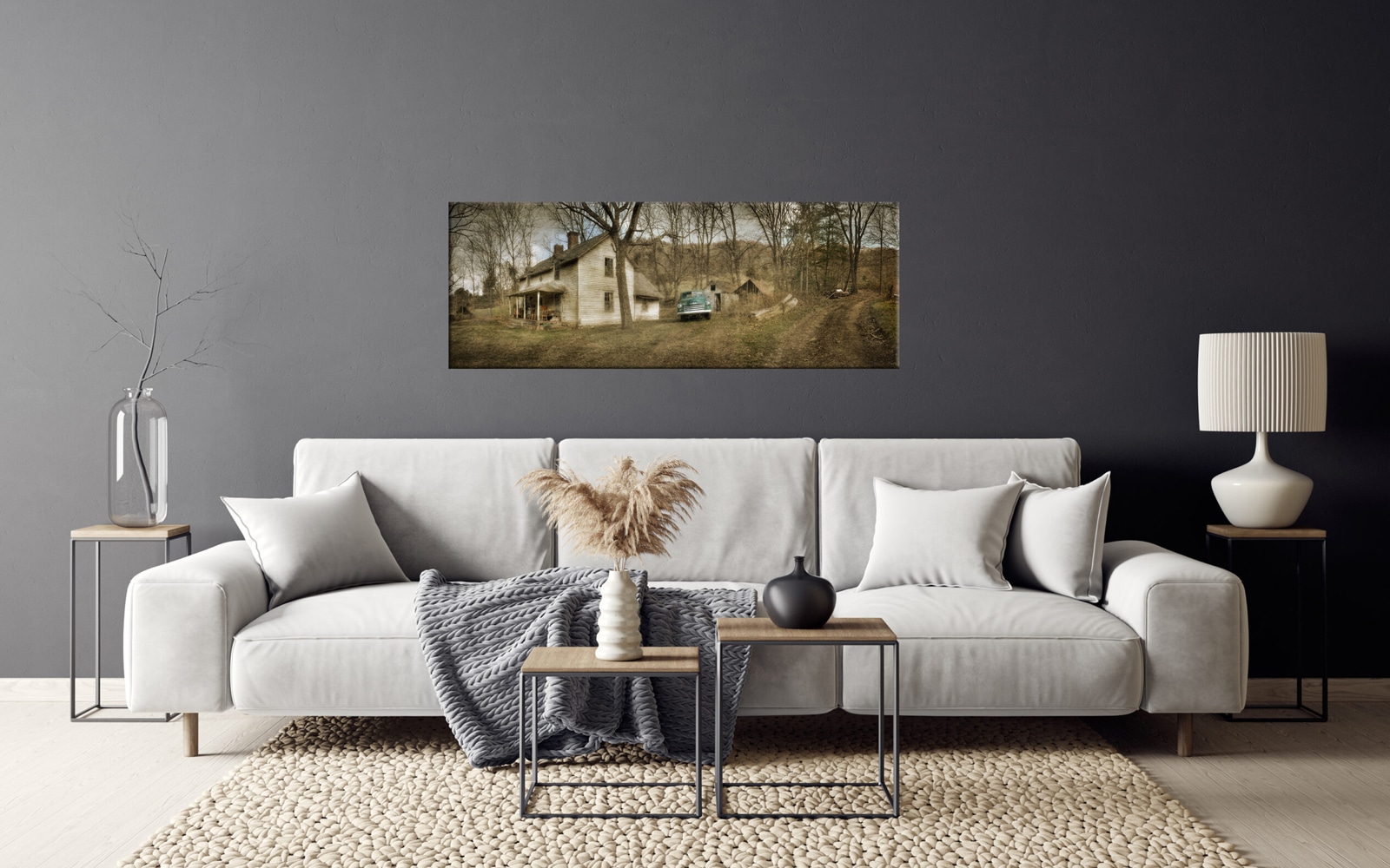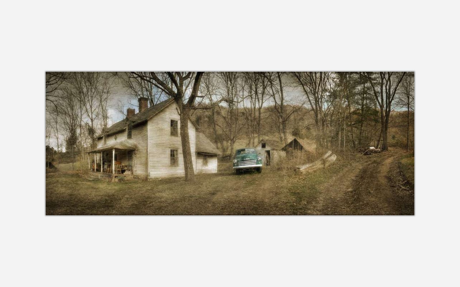 A rustic image of an old abandoned house with a vintage green truck parked outside, surrounded by a barren countryside landscape.