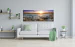 A panoramic seascape photograph of a stunning sunset over the ocean with waves washing over rocky beach foreground.
