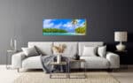 A panoramic canvas print of a tranquil tropical beach with vivid turquoise sea, white sand, and a clear blue sky with fluffy clouds.