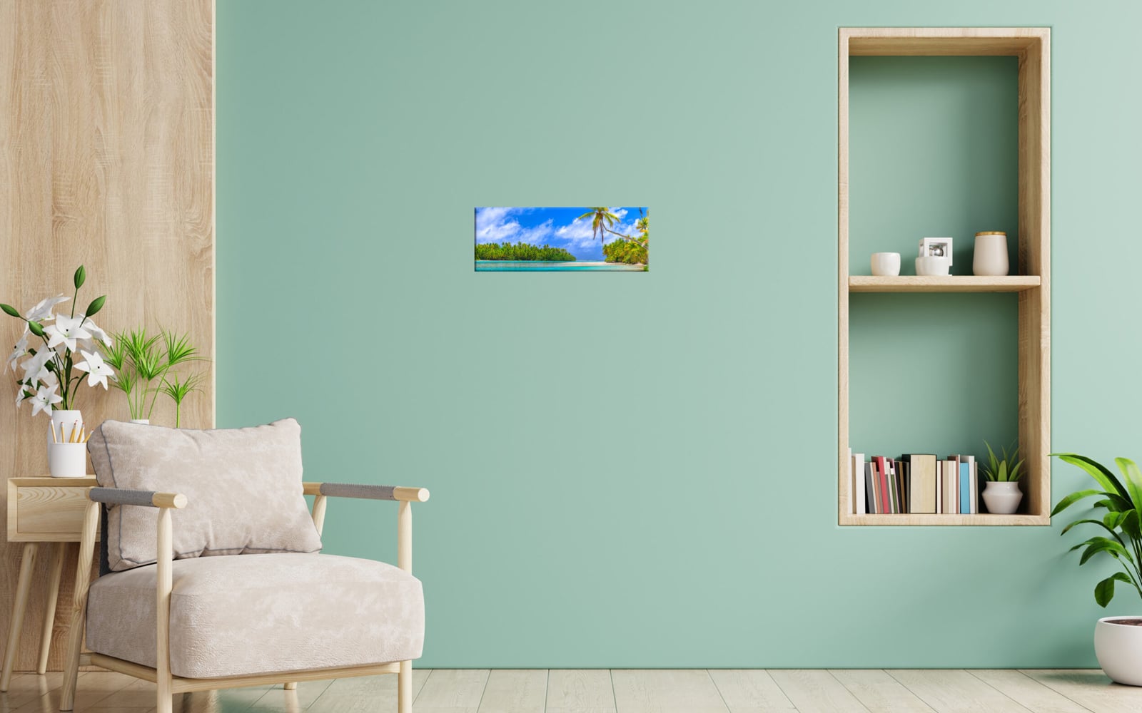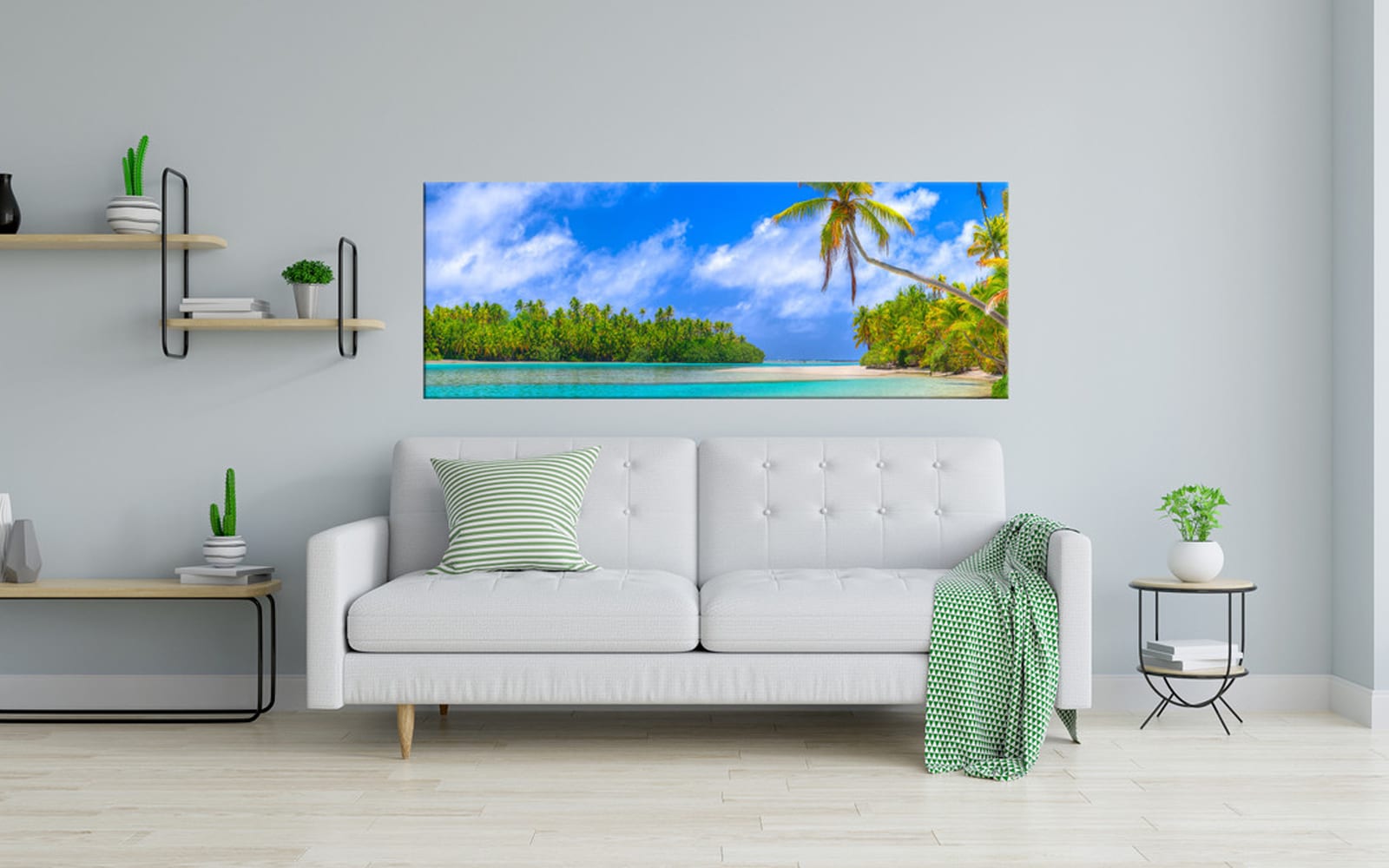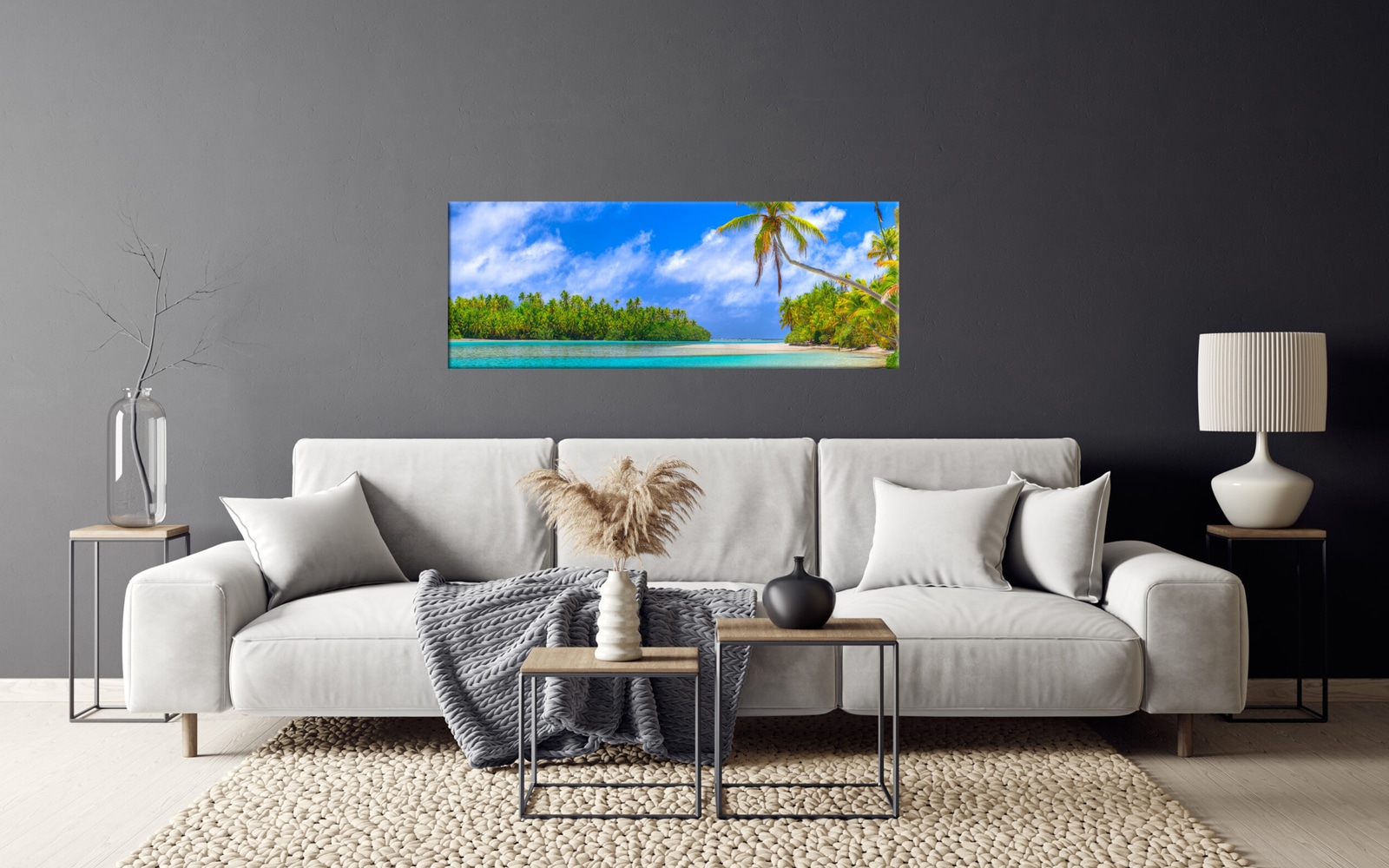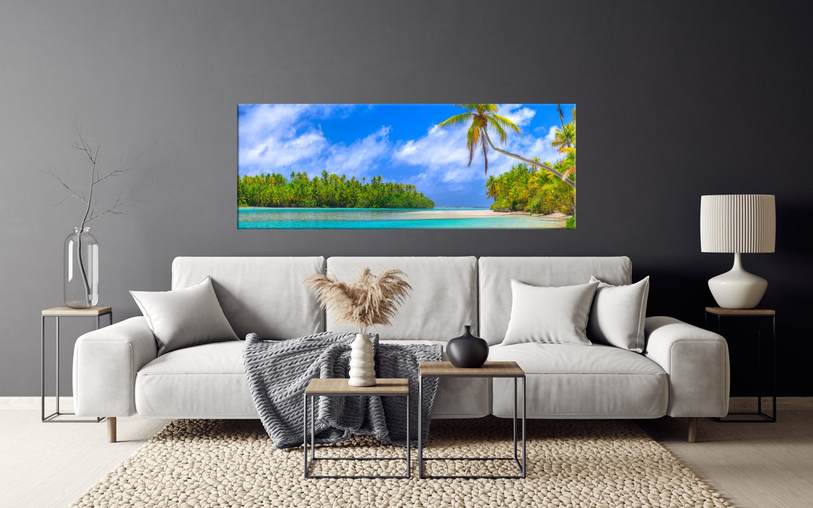 A panoramic art print featuring a pristine tropical beach with clear turquoise waters, lush palm trees, and a sunny blue sky.