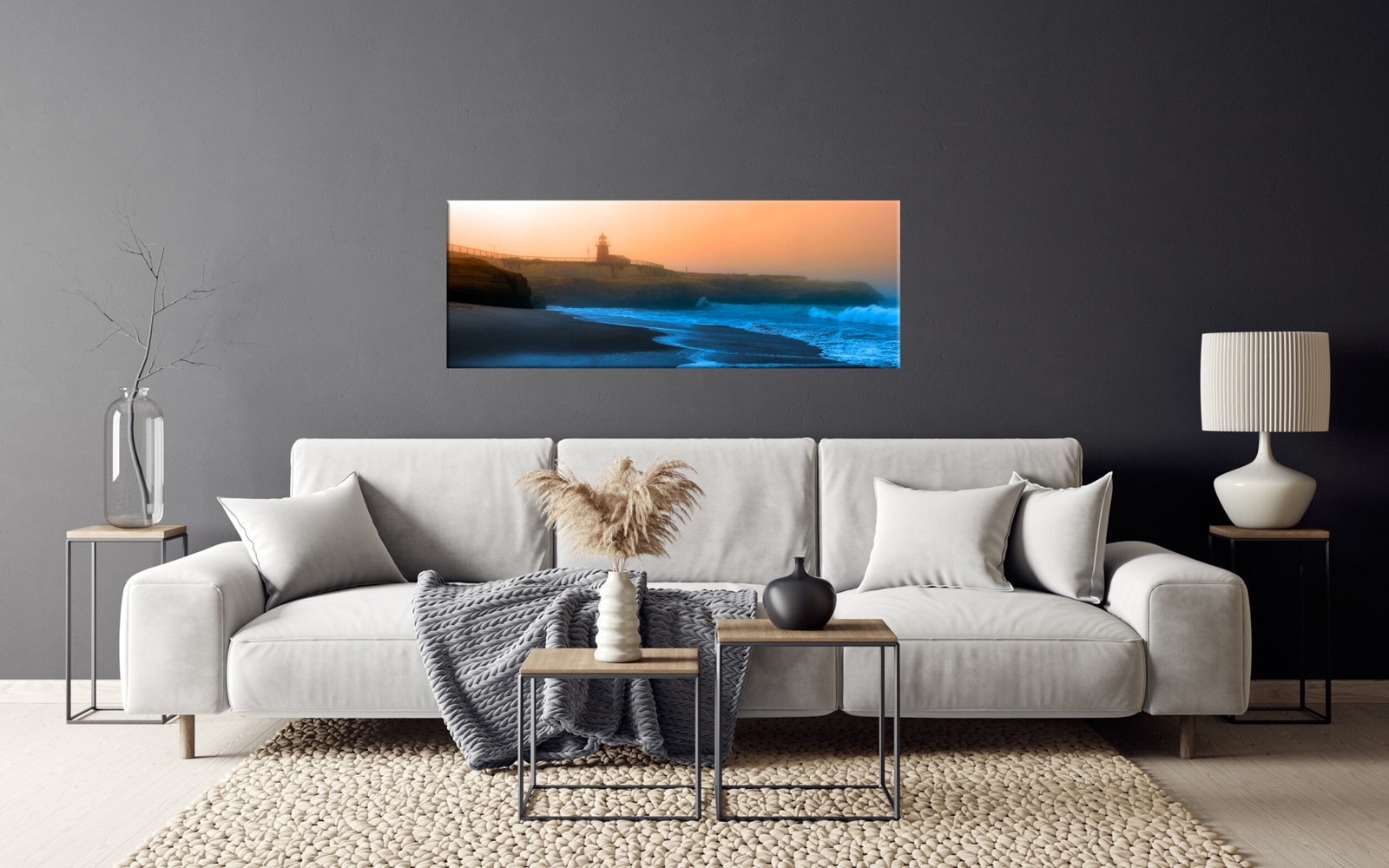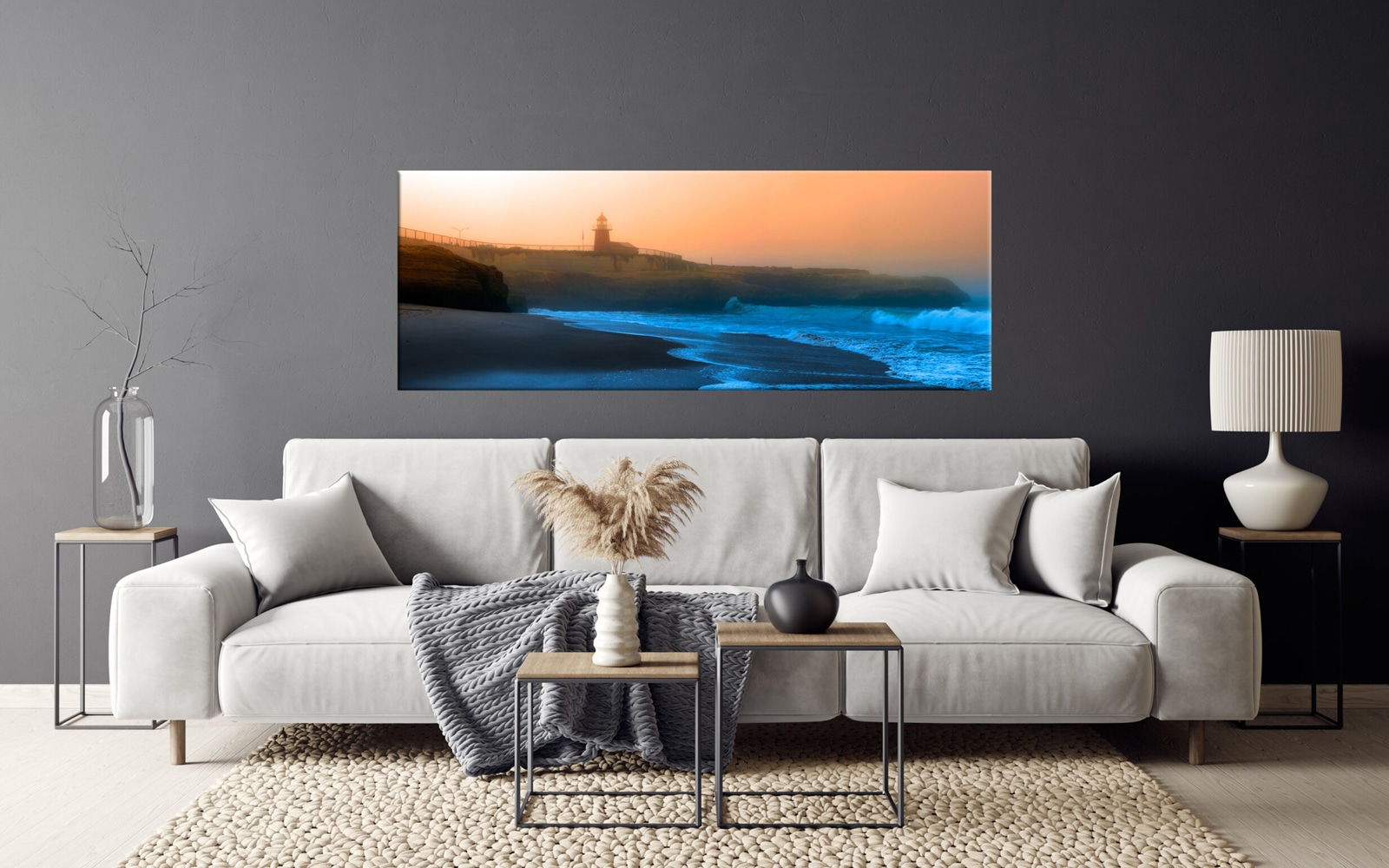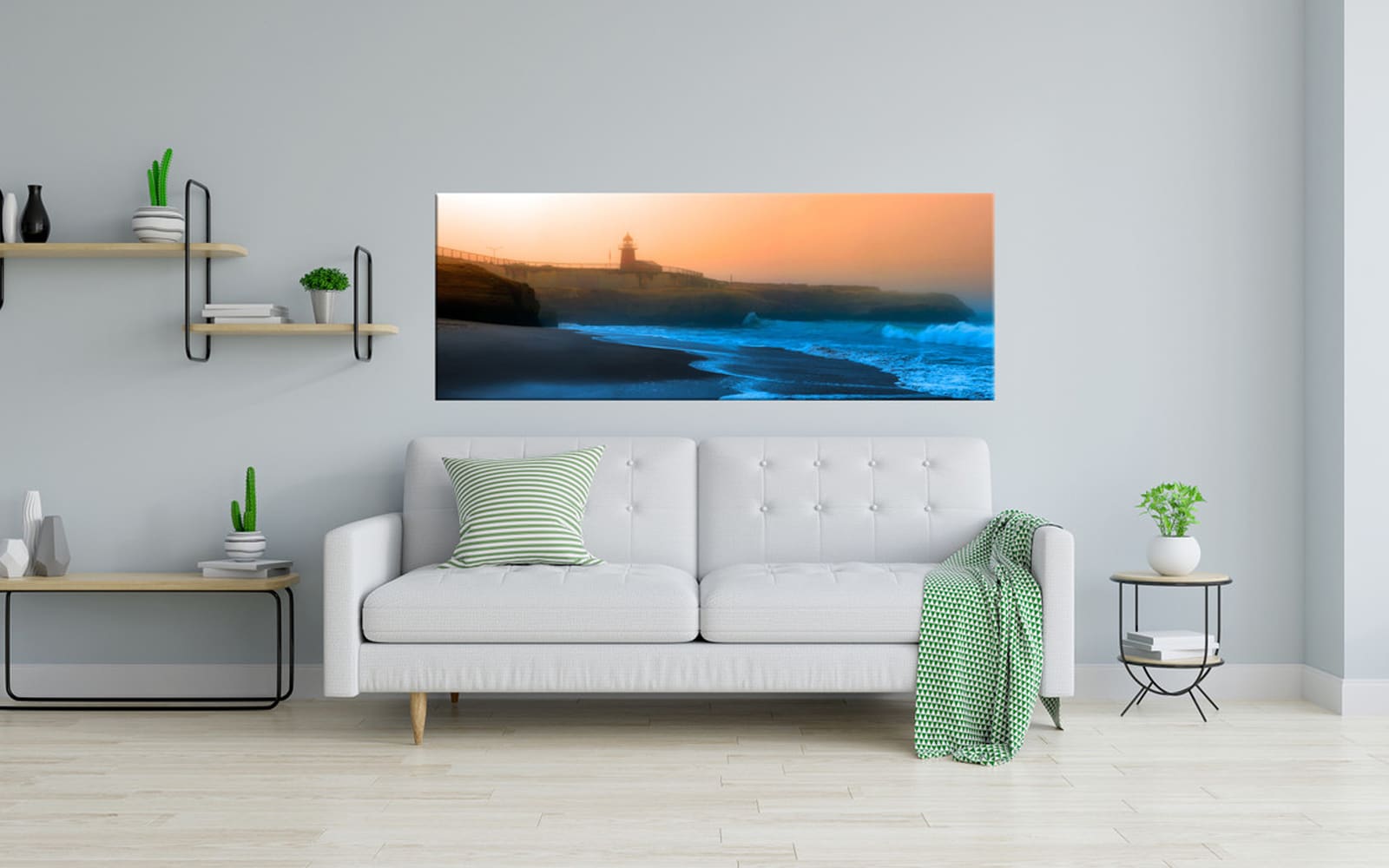A panoramic art piece depicting a historic lighthouse on a rocky coastline with a footbridge leading up to it under a dynamic sky with scattered clouds.