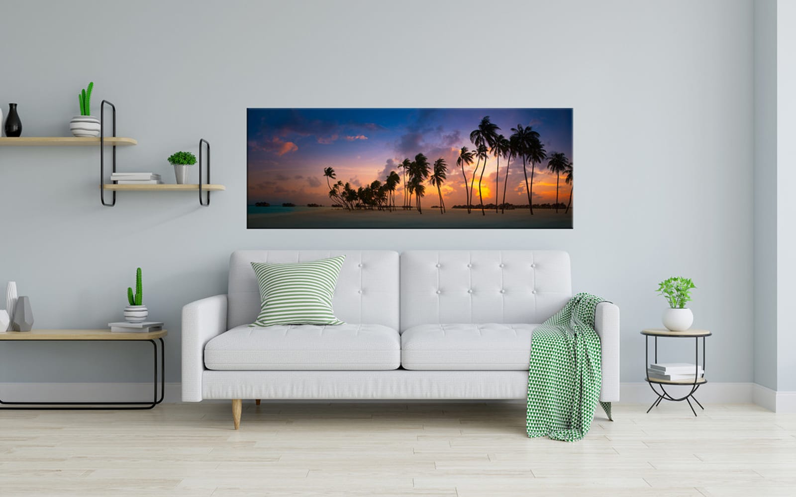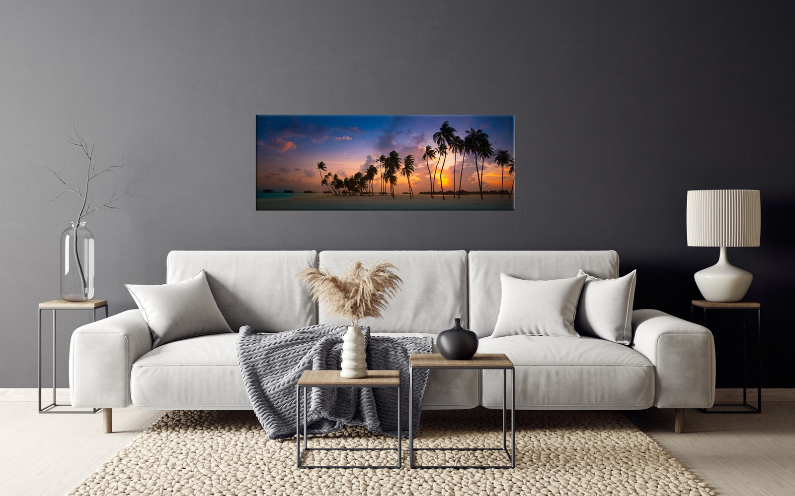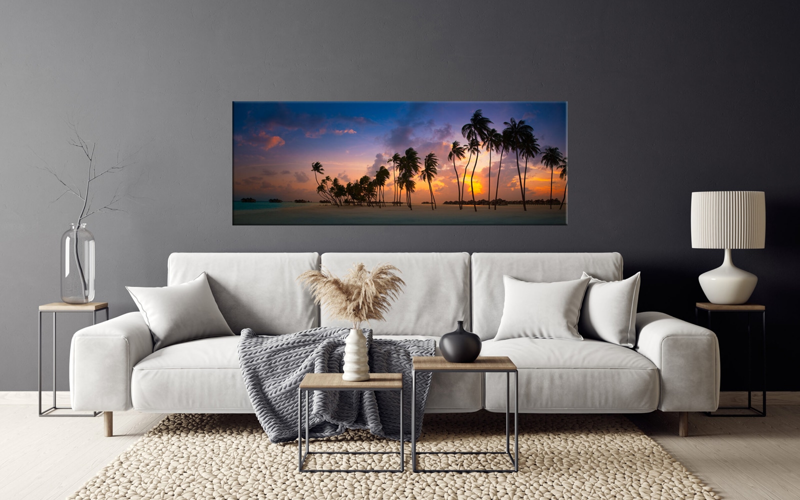 A panoramic art print featuring a pristine tropical beach with clear turquoise waters, lush palm trees, and a sunny blue sky.