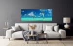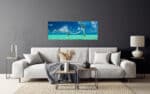 A panoramic canvas print of a tranquil tropical beach with vivid turquoise sea, white sand, and a clear blue sky with fluffy clouds.