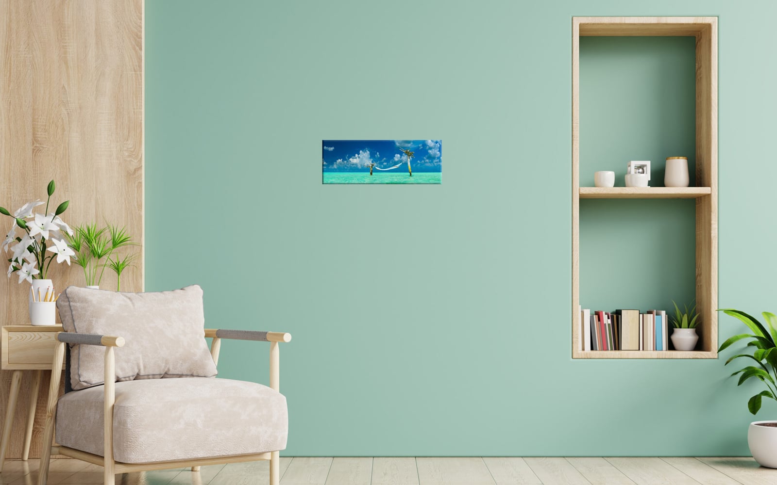 A panoramic wall art of a hammock tied between two palm trees over crystal clear turquoise water under a blue sky with fluffy clouds.