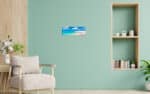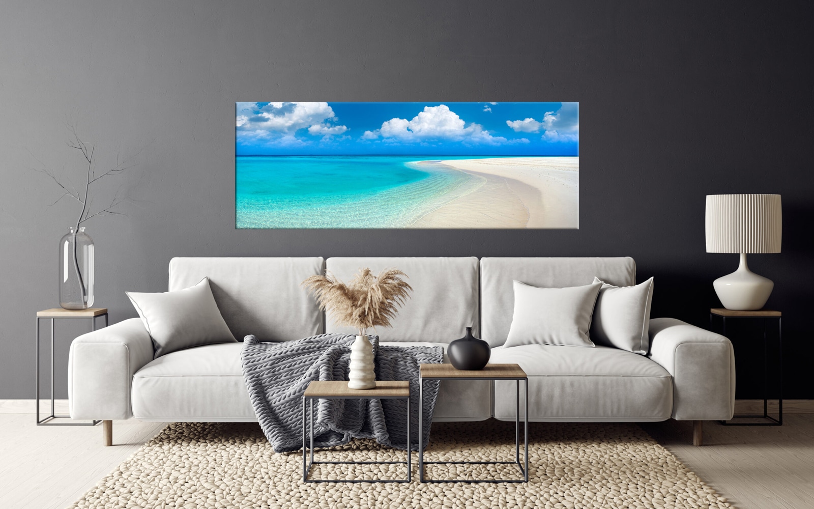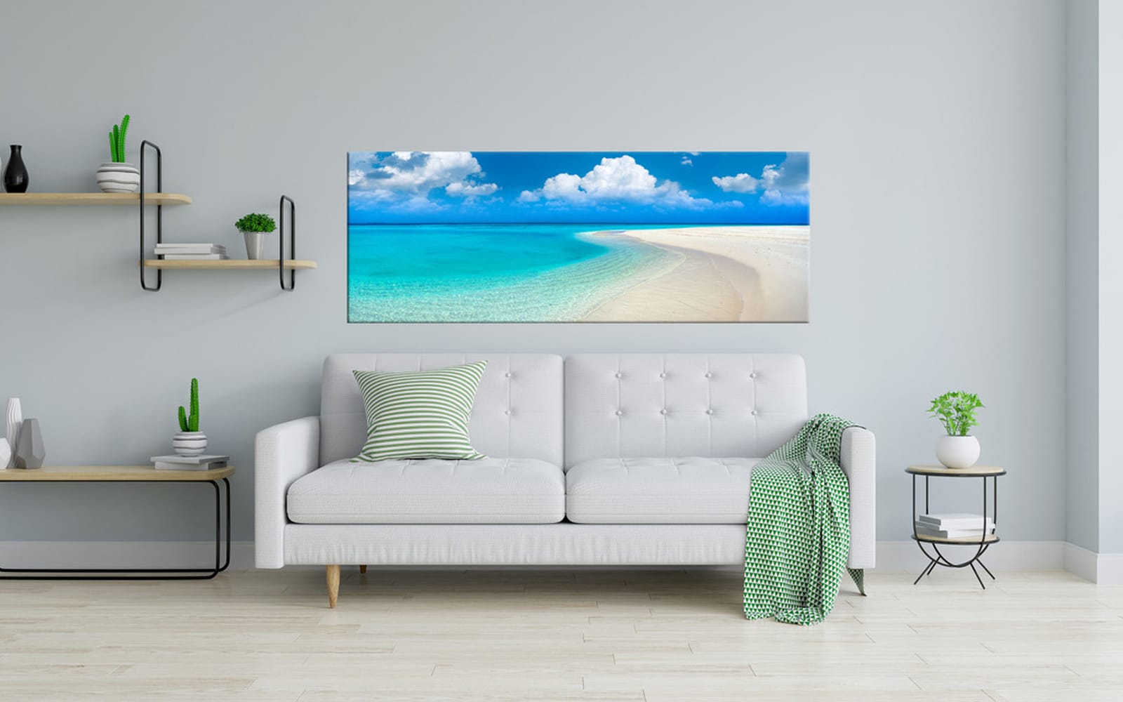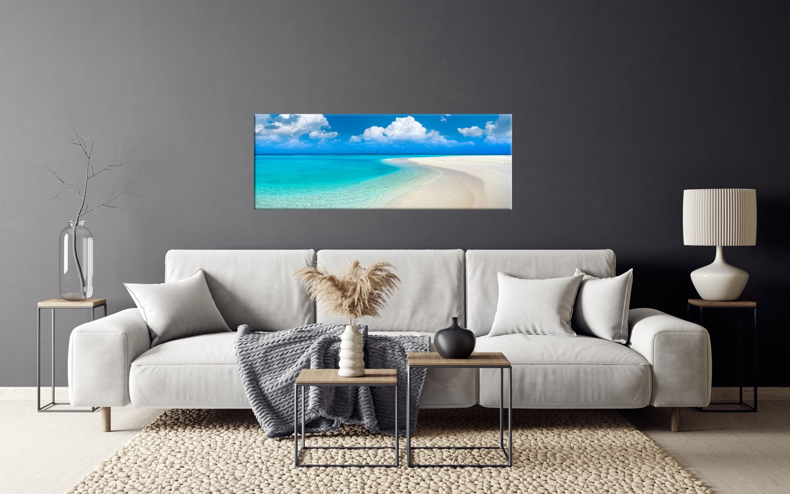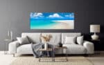 A panoramic canvas print of a tranquil tropical beach with vivid turquoise sea, white sand, and a clear blue sky with fluffy clouds.