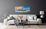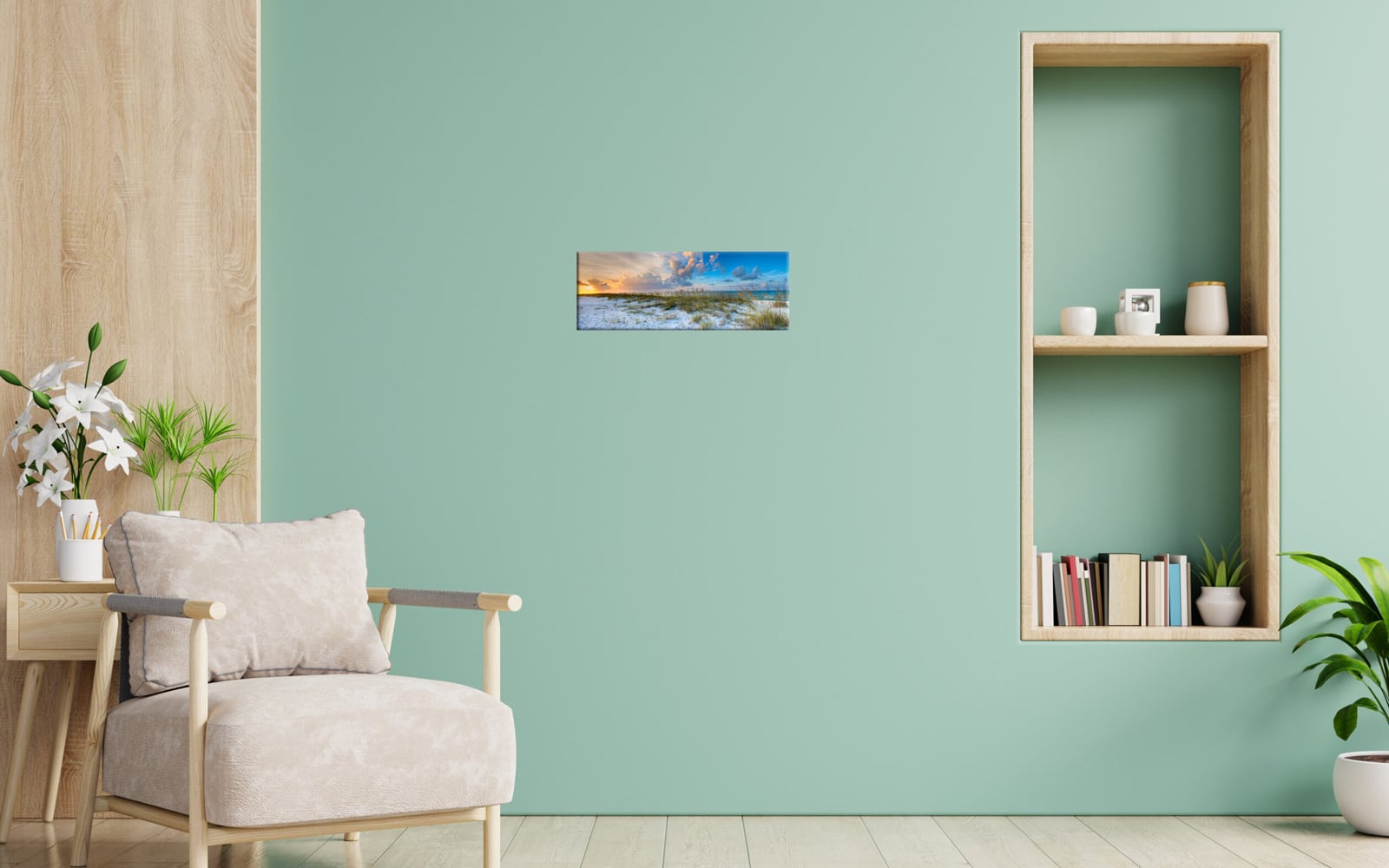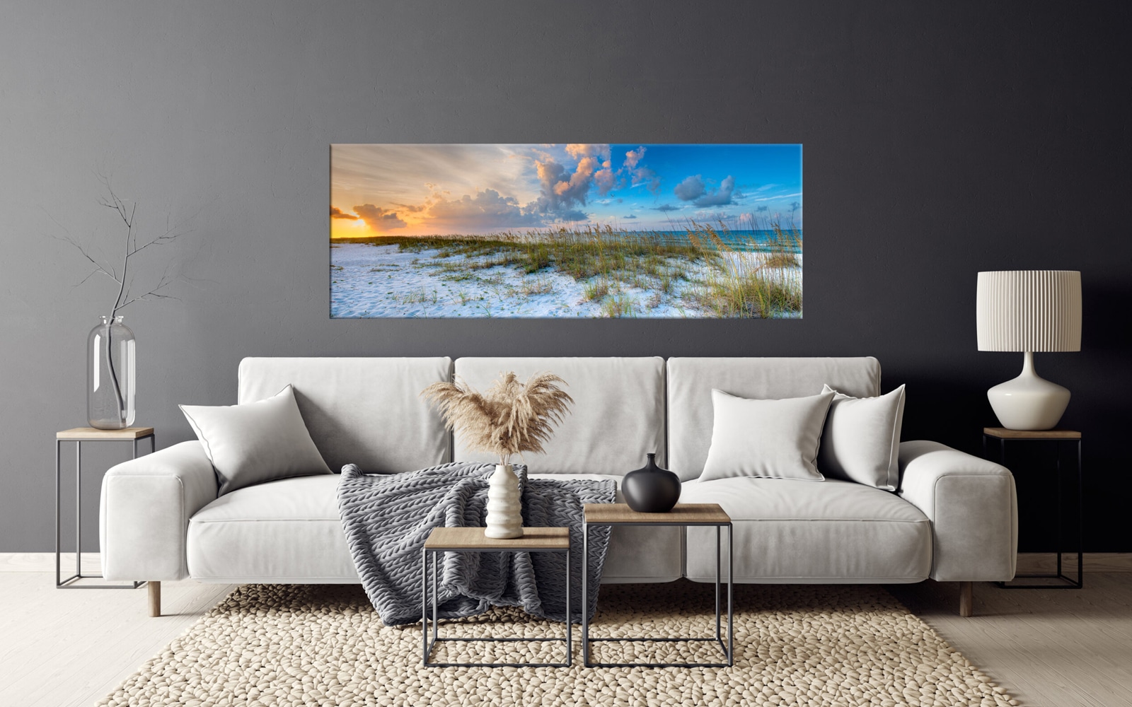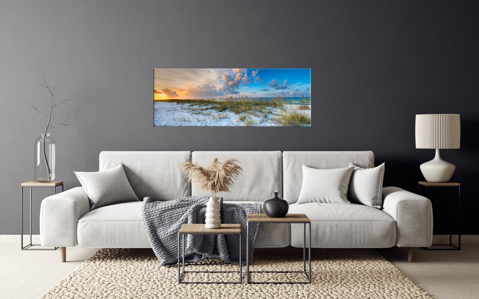A panoramic canvas print of a tranquil tropical beach with vivid turquoise sea, white sand, and a clear blue sky with fluffy clouds.