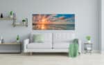 A panoramic canvas art print of a coastal scene with tall palm trees against a bright blue sky, overlooking an ocean with red flowers in the foreground.