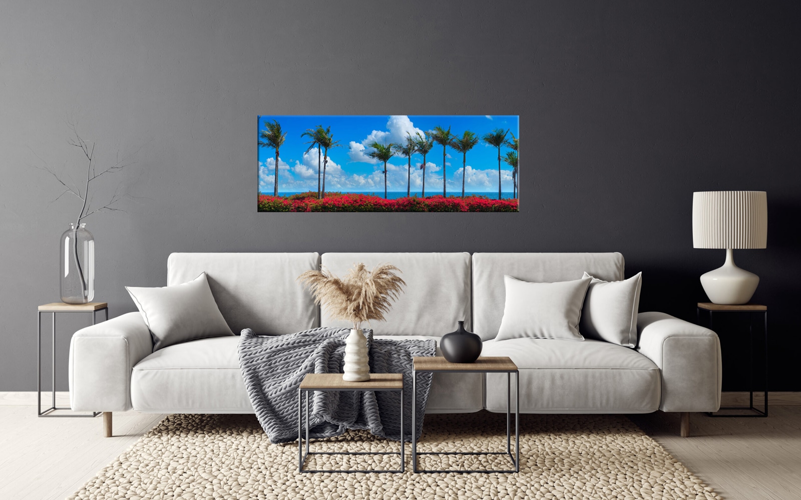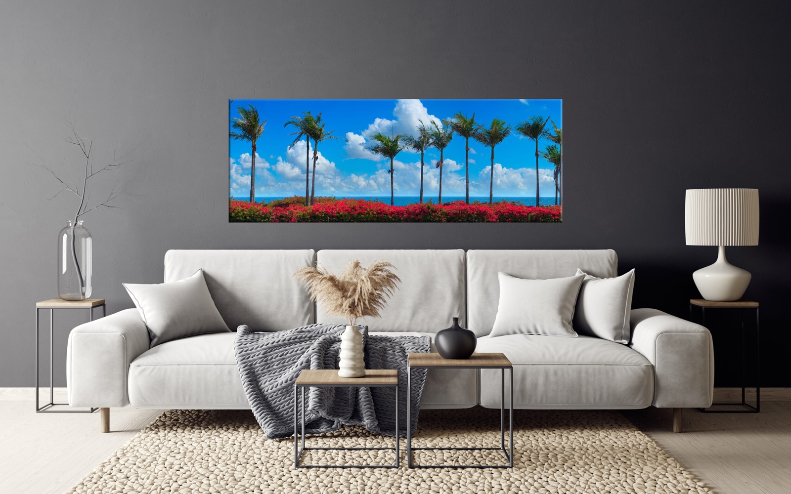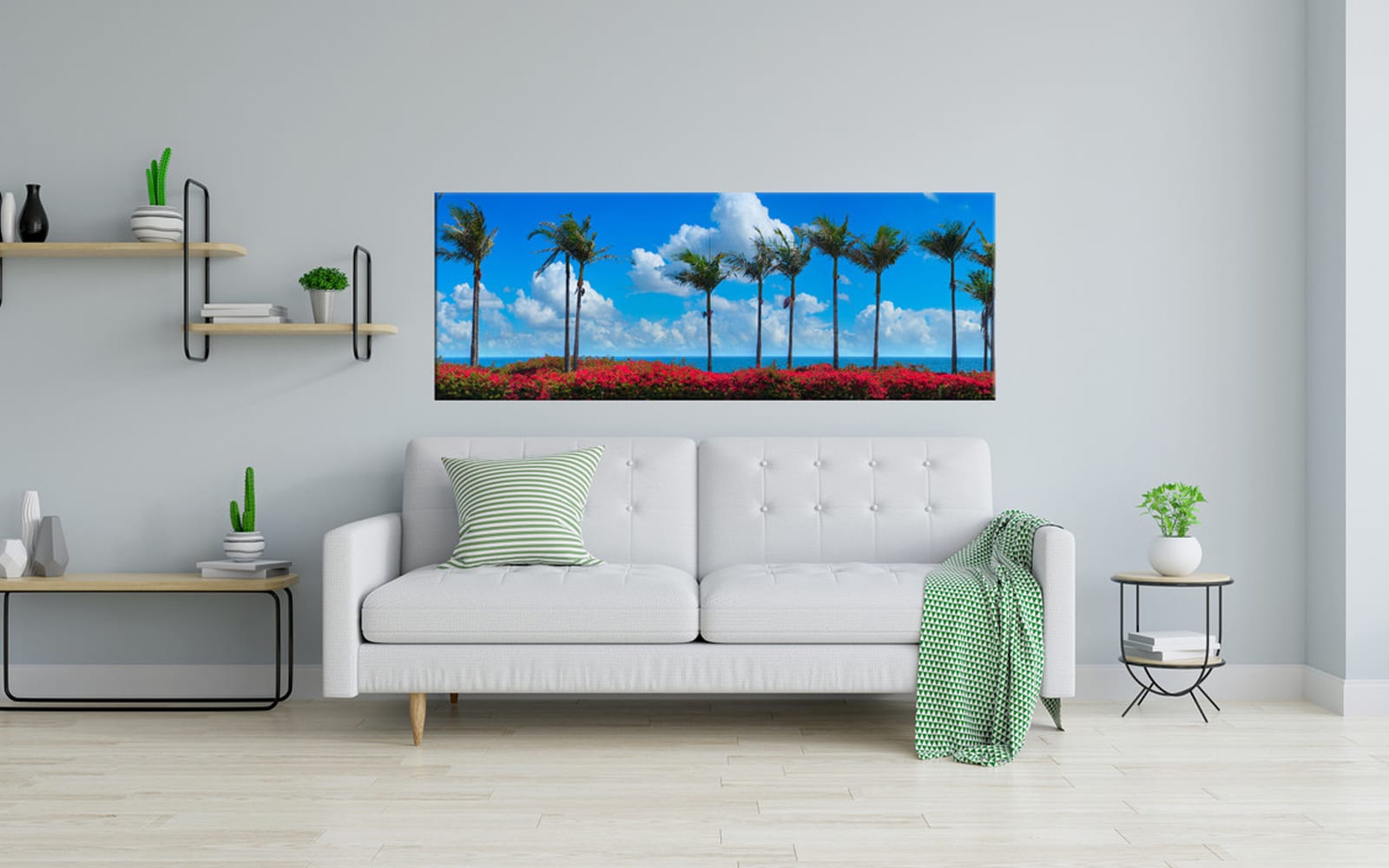 A panoramic canvas art print of a coastal scene with tall palm trees against a bright blue sky, overlooking an ocean with red flowers in the foreground.